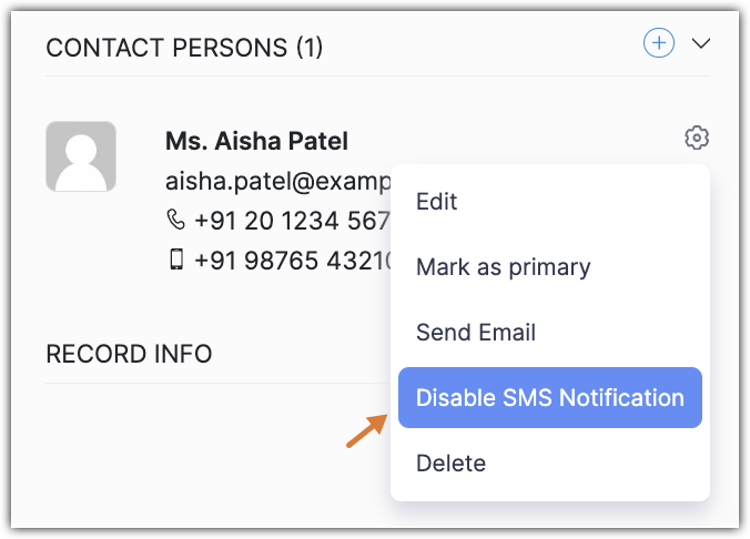 Click the Settings icon next to the Contact Person and click Disable SMS Notification.