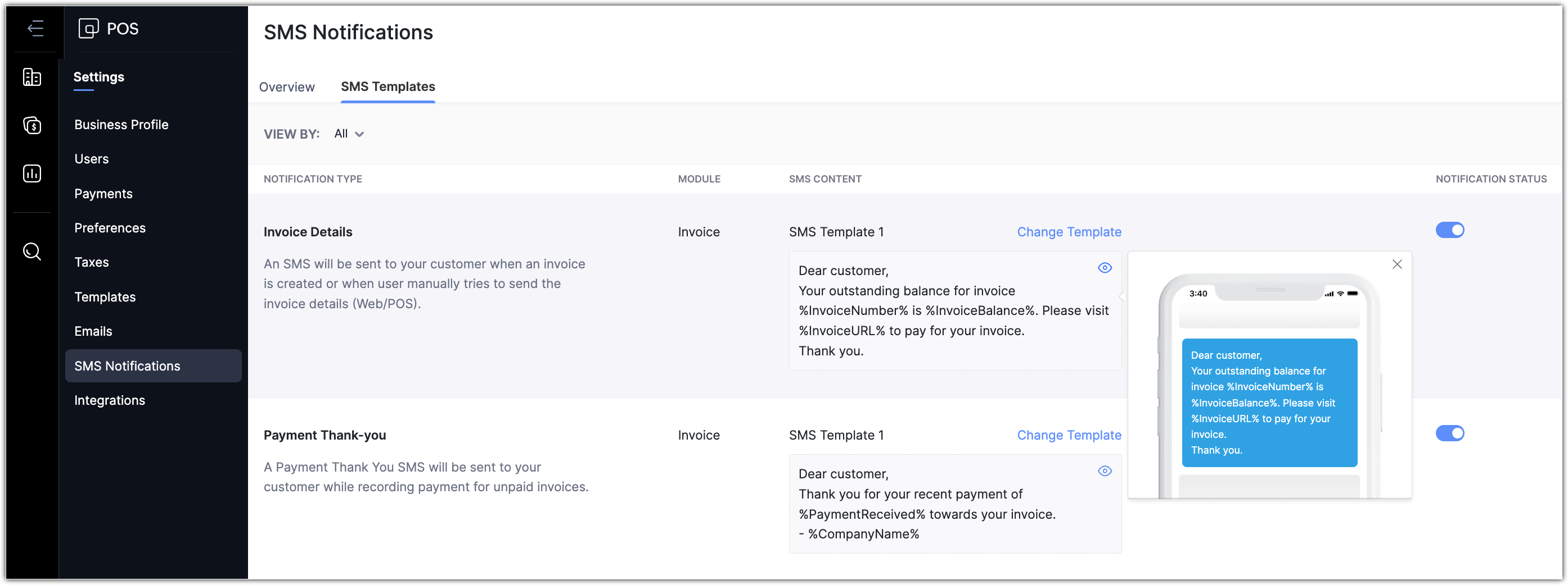 Enable the Notification Status toggle switch for the appropriate Notification Type.You can preview SMS content by clicking the Preview icon.