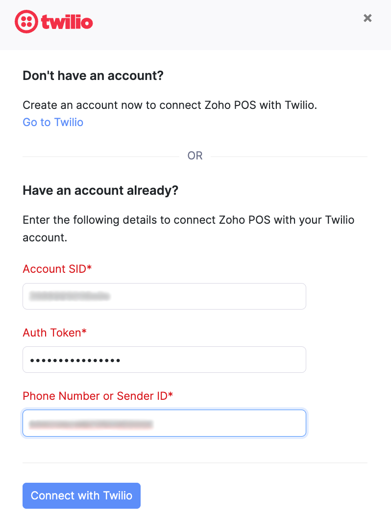 Enter the Account SID, Auth Token, and Phone Number, then click Connect with Twilio.