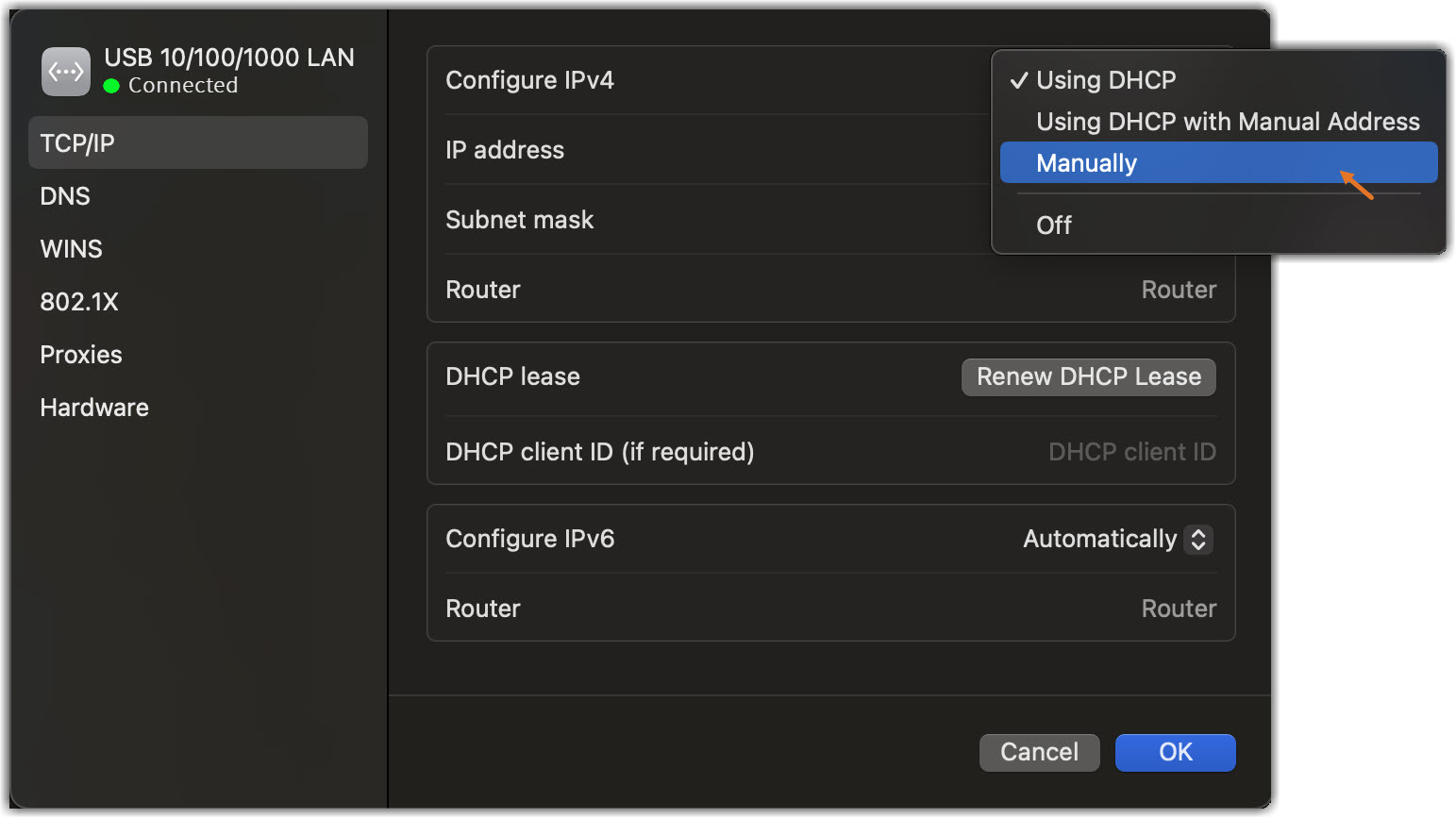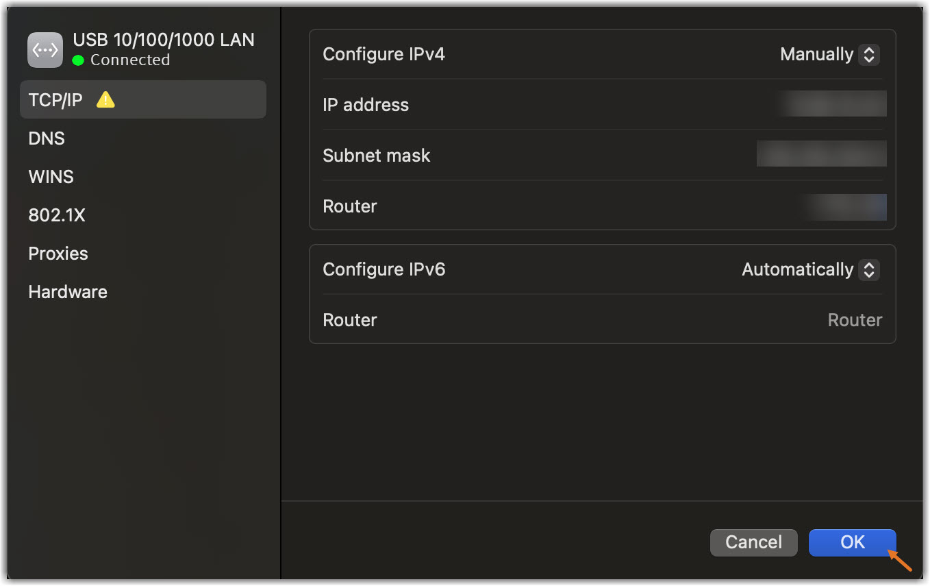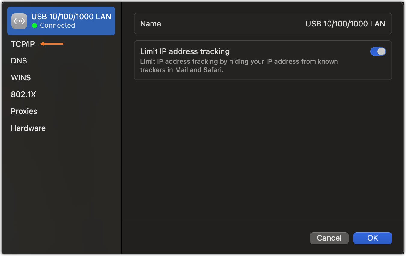 - Select the TCP/IP tab in the left panel of the window that appears.