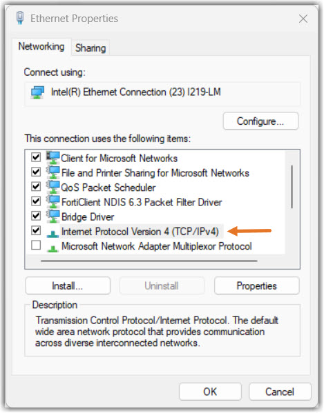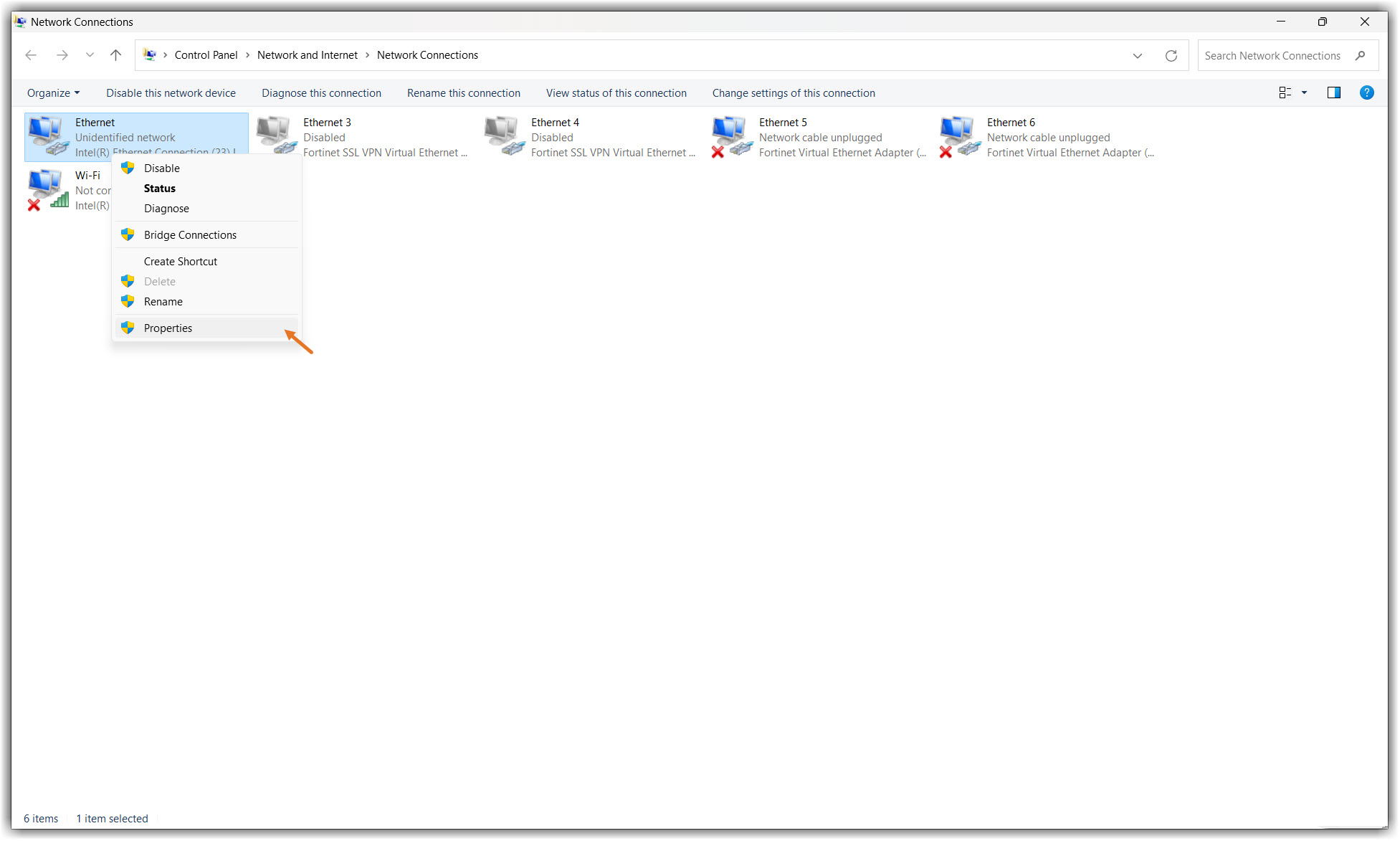 - Right-click the Ethernet connection to which the printer is connected and select Properties.