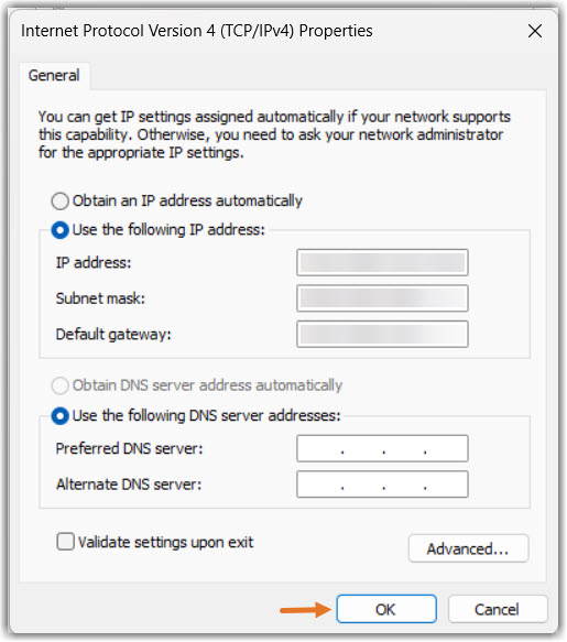 - Enter your new IP address, Subnet mask, and gateway (Router) and click OK.