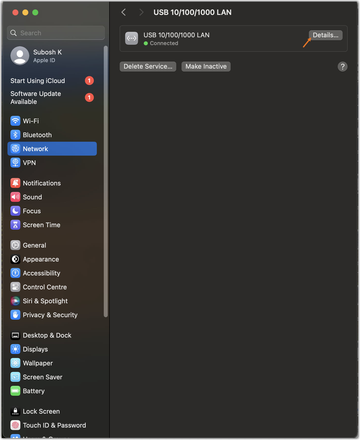 - Choose the Ethernet connection in which the printer is connected and click the Details button next to the network name.