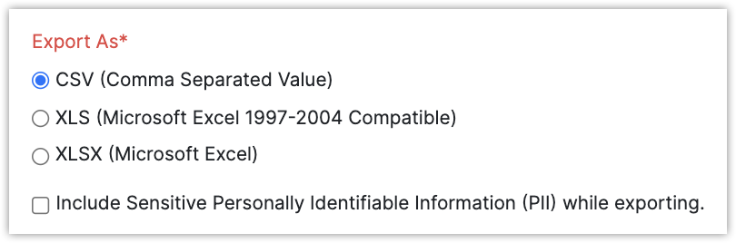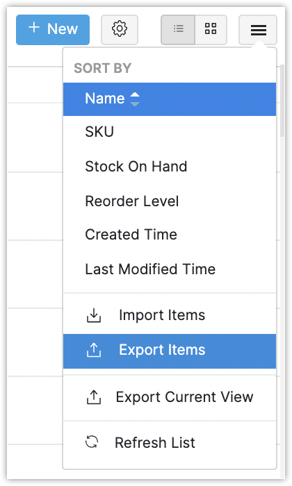 All the Items present in the Items module can be exported in a .CSV, .XLS, or .XLSX format. You can also choose to export the items that are added during a time period. The export file consists of all the field values in the respective columns.