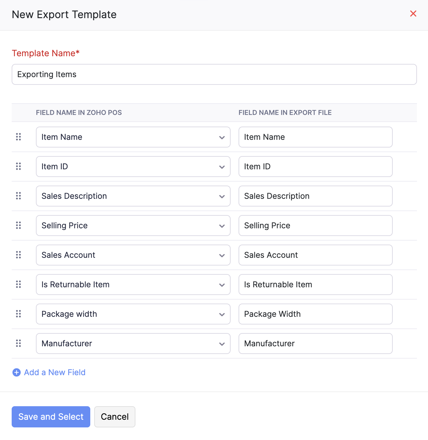 Click Add a New Field and select a field from Zoho POS.You can modify the Field Name in Export File if required.