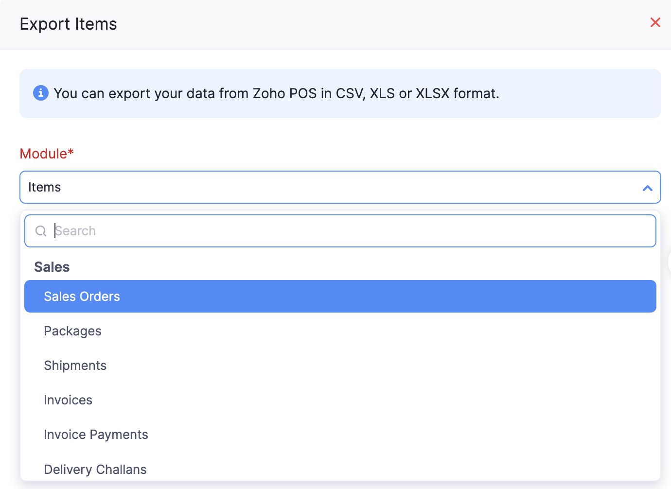 You can export data from the Items module in Zoho POS to a .CSV, .XLS, or .XLSX format. You have the option to export all items or those added during a specific period.