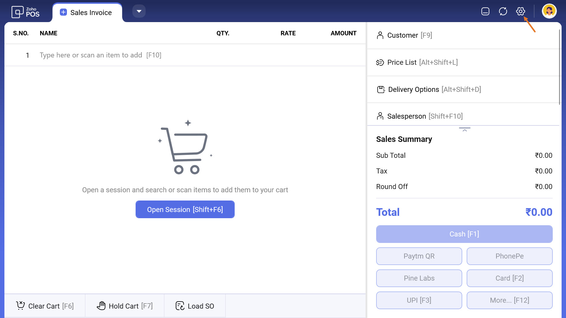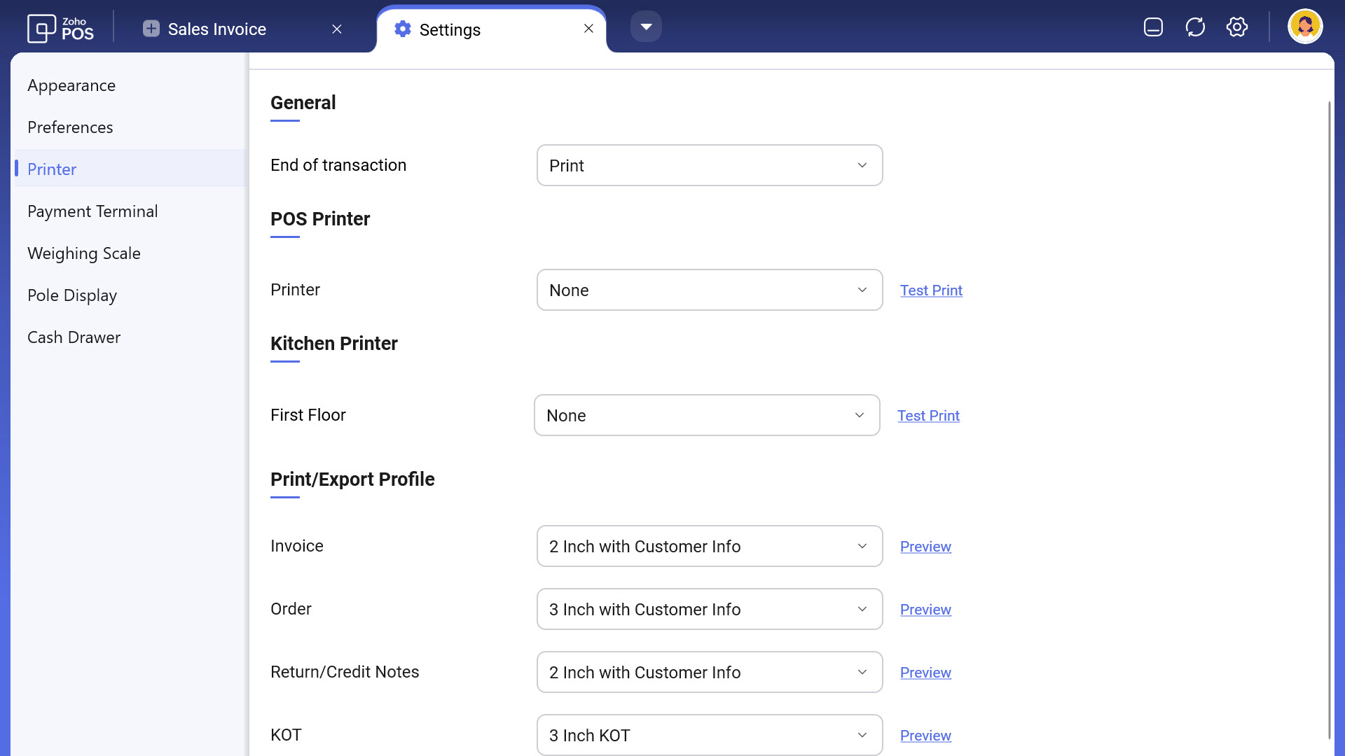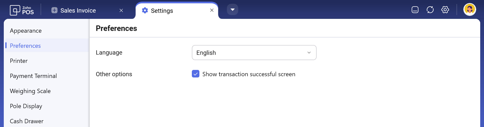 Click the drop-down icon and select Settings in the Zoho POS app.