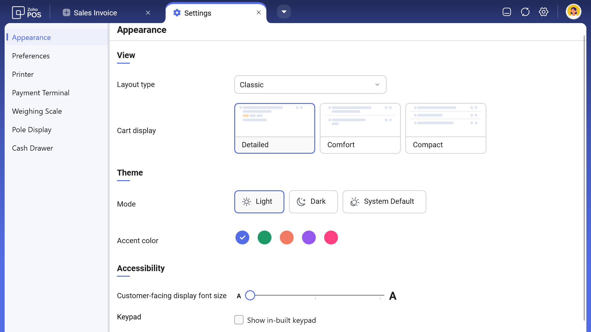 In the Accessibility section, select an appropriate Theme.Specify a font size for the Customer Facing Display and Select Show in-built keypad to view keyboard on your screen.