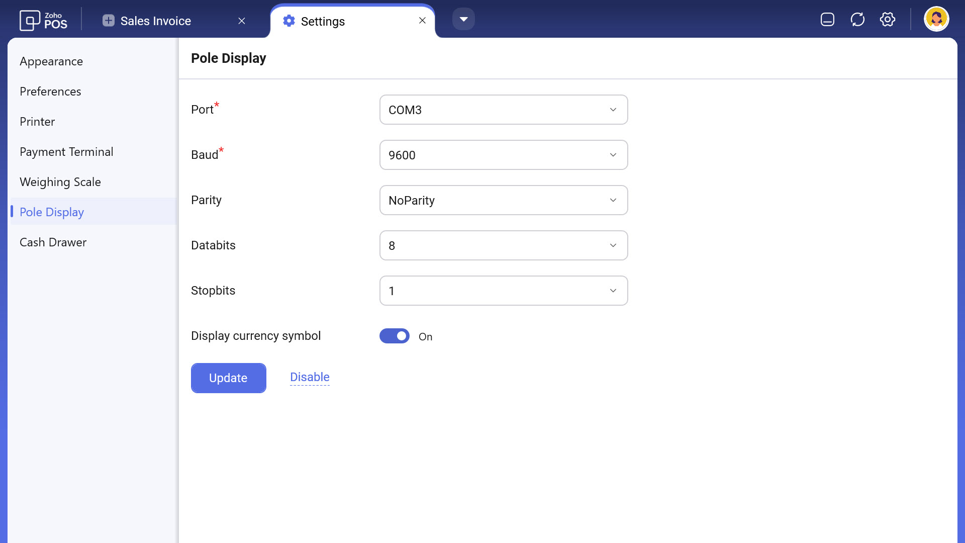 Display currency symbol: Enabling this option will display the currency symbol in the pole display.