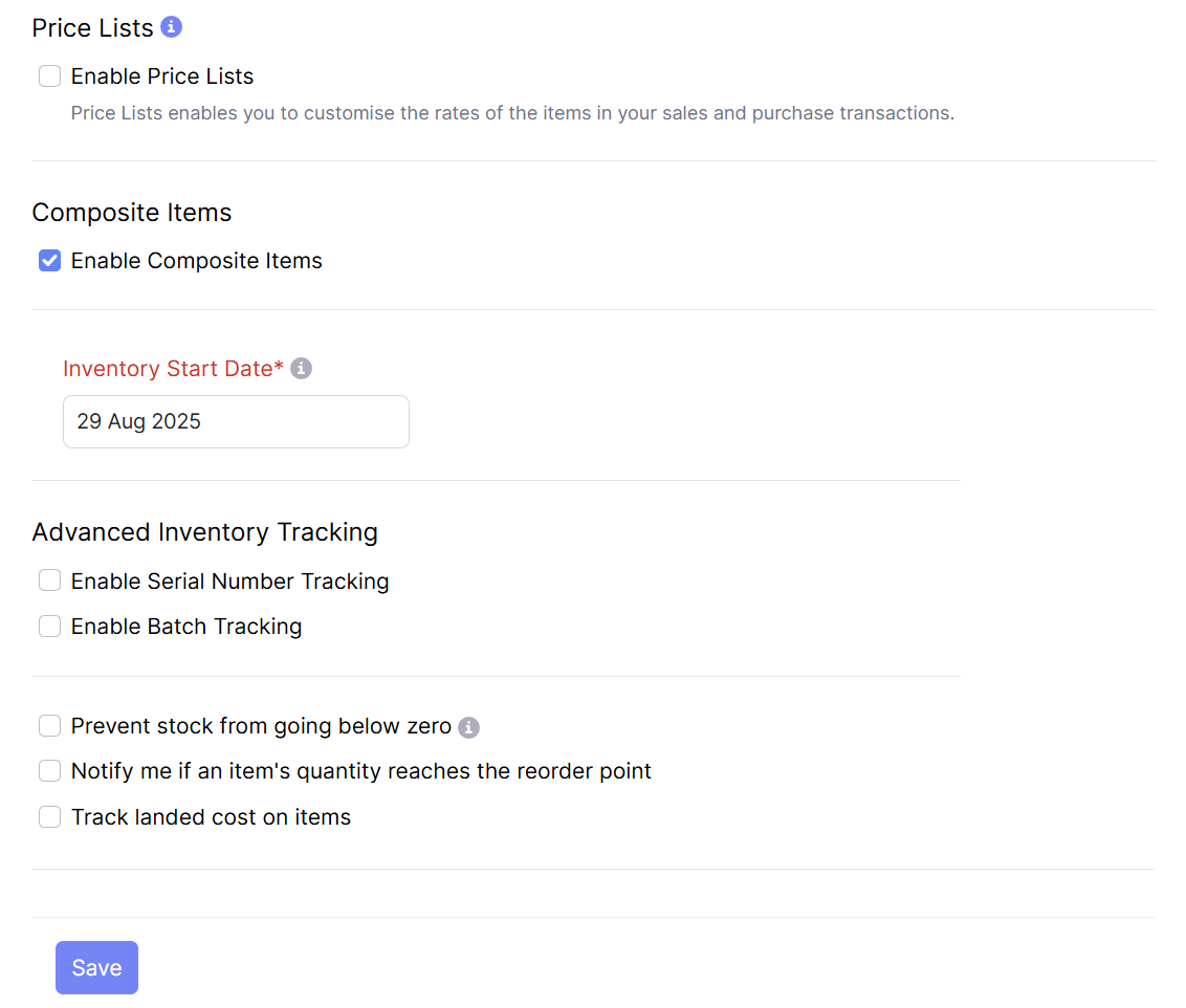 Enable Composite Items and Price List Select the checkboxes to enable Composite Items and Price List in Zoho POS. Composite Items help in creating a customized bundle of items, and Price Lists help in defining customized prices for items.