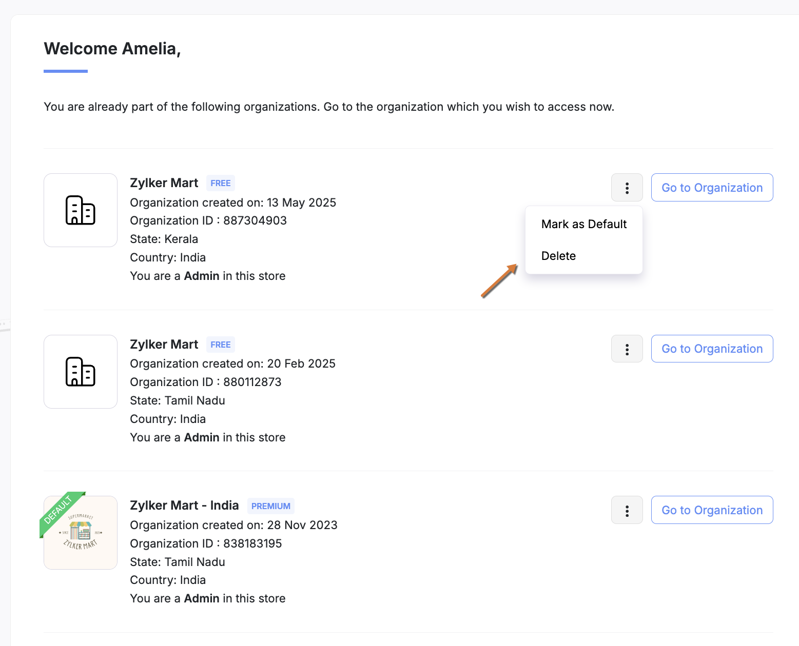 Choose the business that you wish to access and click the icon next to the Go to Store option and select Mark as Default.