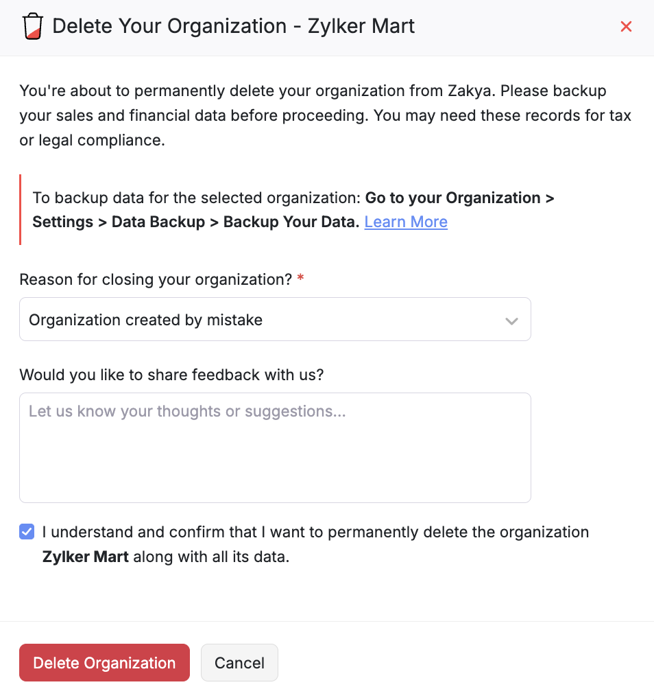 The Business/Organization created in Zoho POS can be deleted by the admin, i.e. the user who created the organization. This action deletes all the data present in the business, and it's recommended to take a backup before deleting the business entirely.