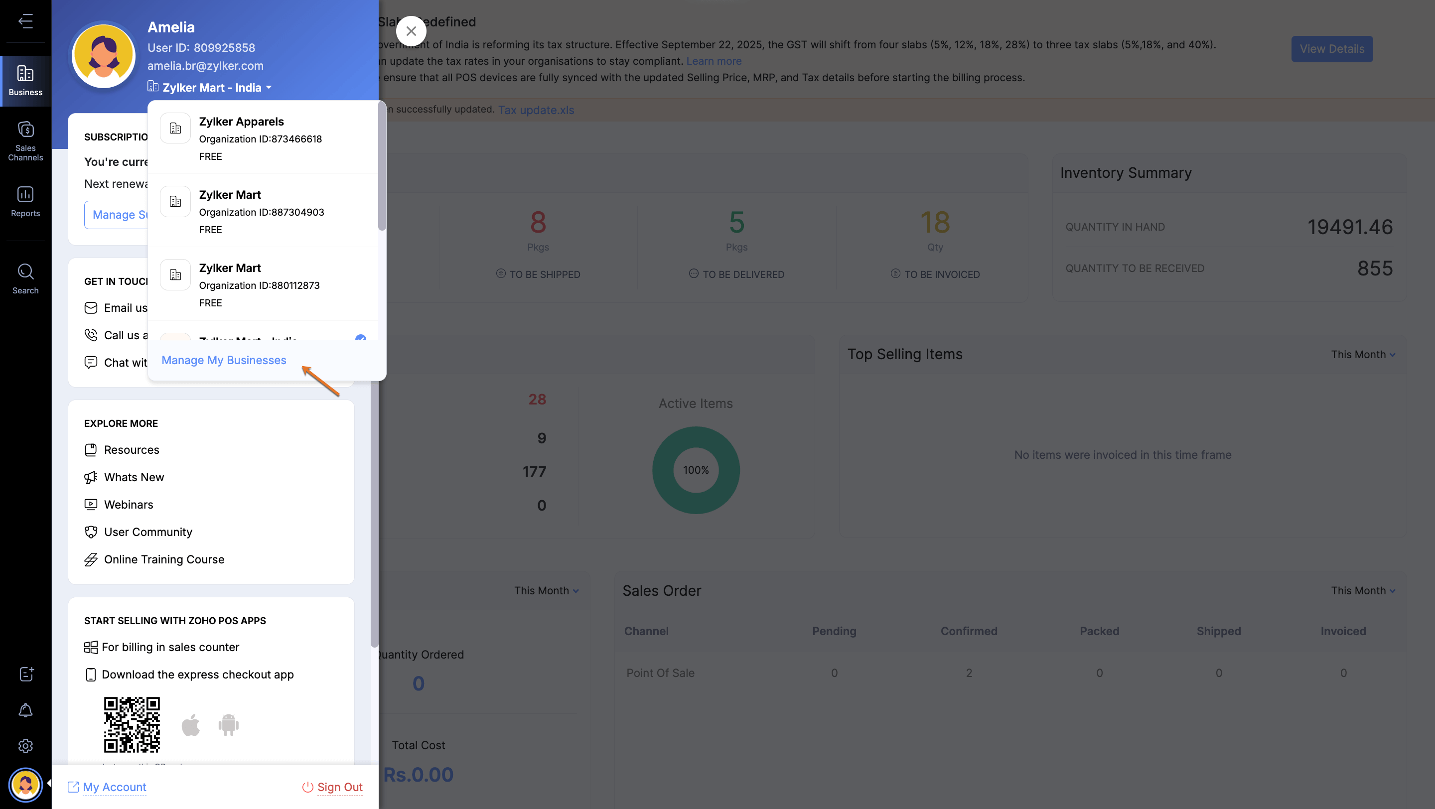 For example, imagine a scenario where you use Zoho Inventory for a wholesale business, and in its retail part, you want to use Zoho POS. Once you link this business to the Zoho Inventory with Zoho POS, all the similar modules like sales, inventory, purchase, and more will get synced with Zoho POS. After that, any items added to the inventory module, invoices created under the sales module, or vendors added under the purchase module will be synced with Zoho POS and vice versa. This allows you to manage these businesses together and generate reports for GST filing and other purposes.