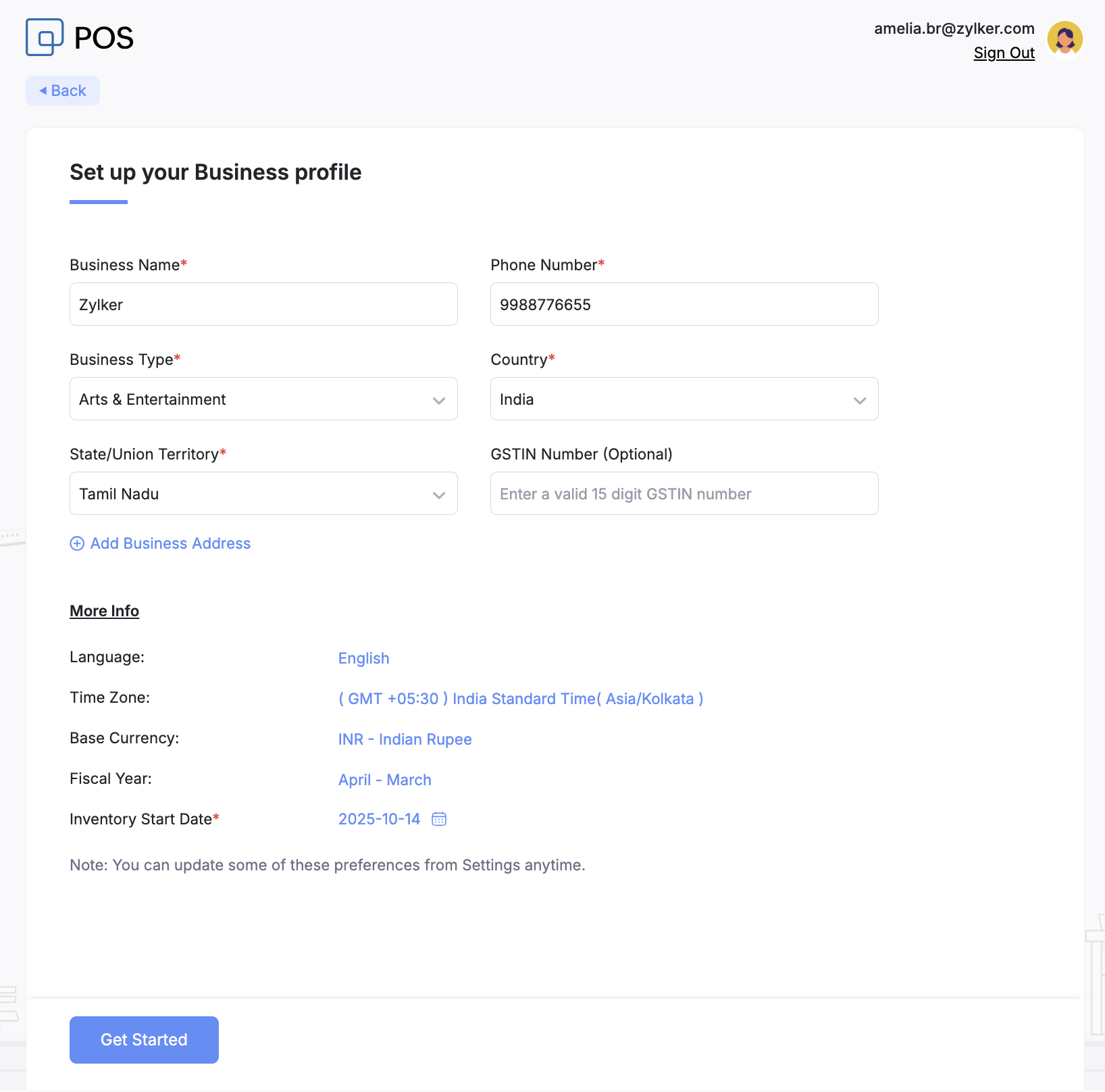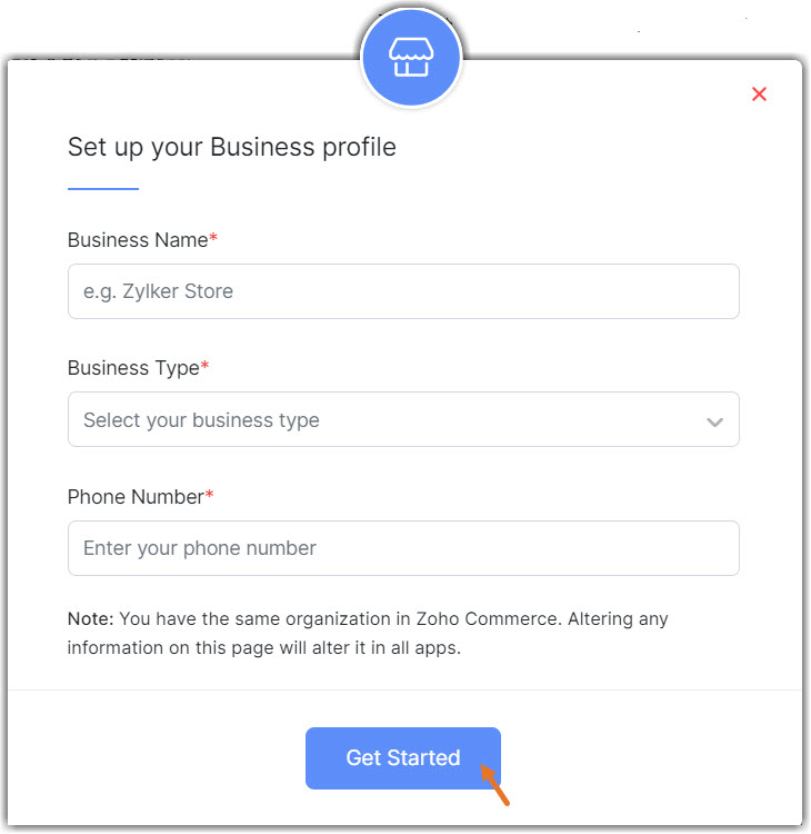 In the Set up your Business profile pop-up, enter the required details and click Get Started.