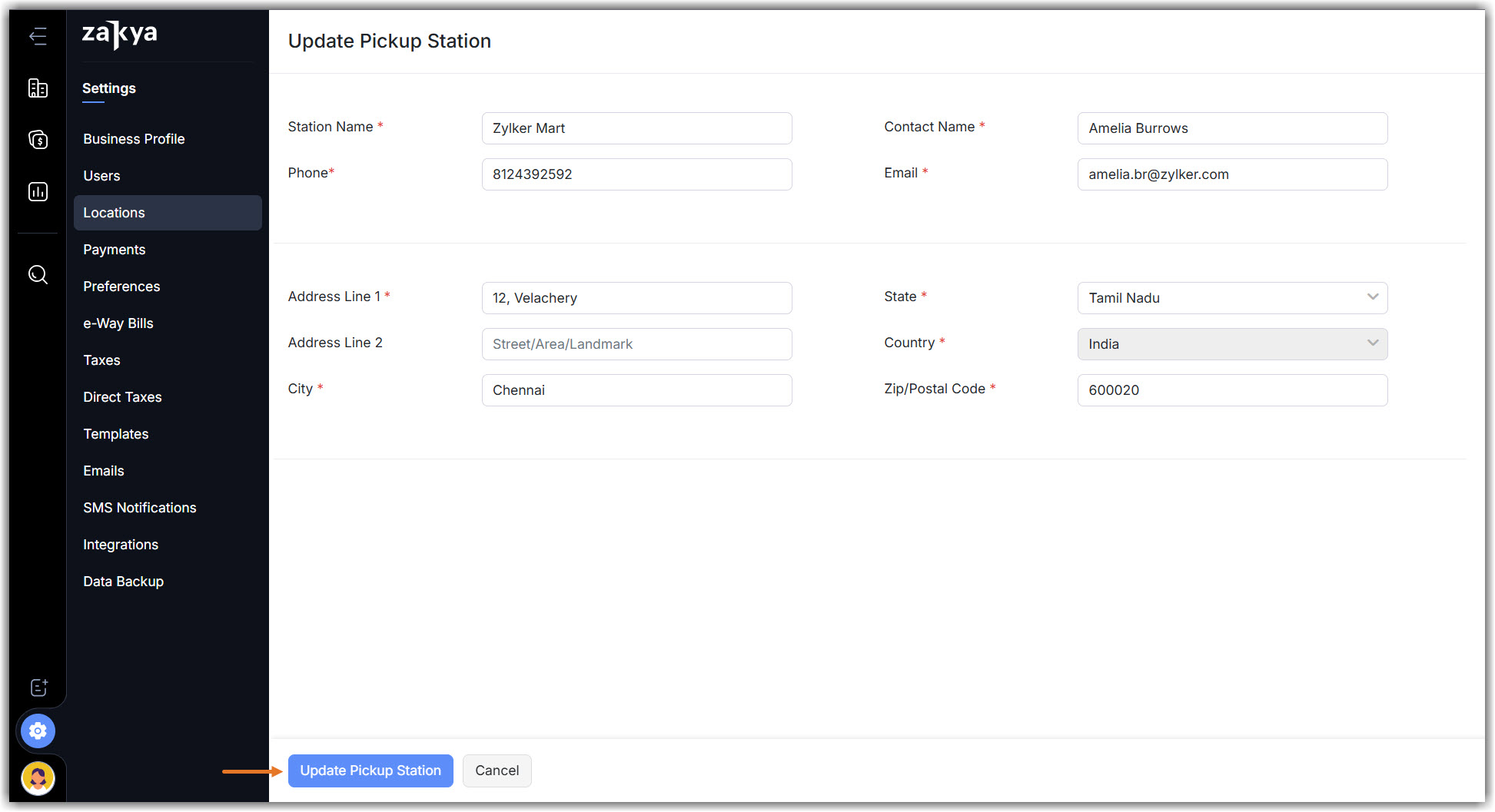 Modify the information in the required fields and click Update Pickup Station.