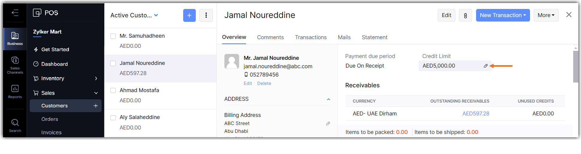 In a credit sale, the amount owed by the customer will be recorded as outstanding receivables. Credit limit helps control the maximum outstanding receivable that a customer can have at your store.