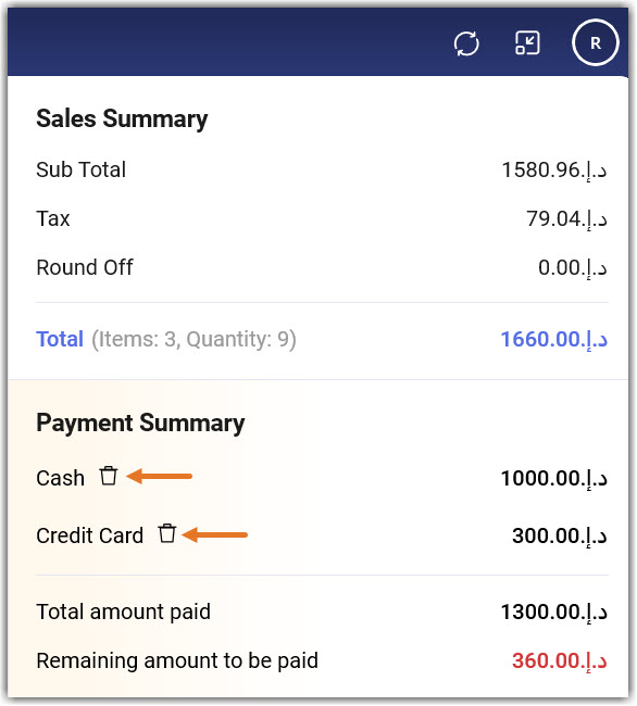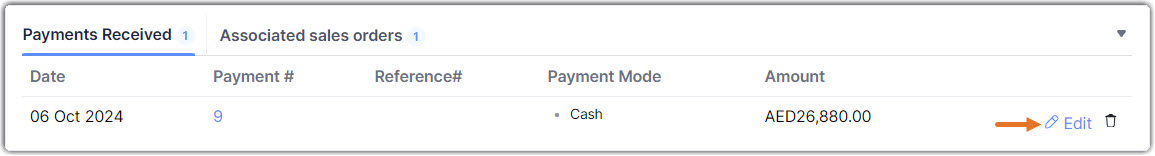 The payment details for a sales order can be deleted by selecting the Delete icon. Once deleted, it cannot be retrieved.