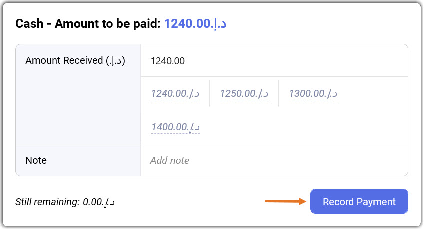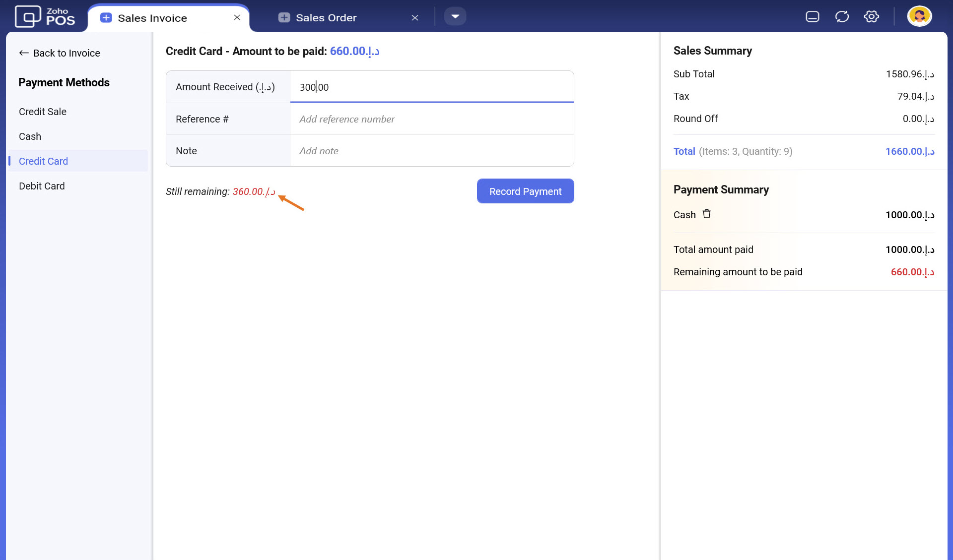 Select the Payment Method from the left and specify the Amount.You can see the amount that's yet to be paid.