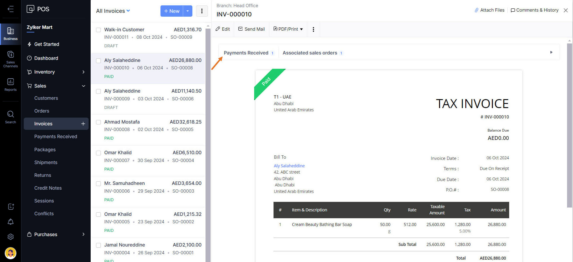 The payment details section displays information such as the total amount paid, the mode of payment, invoice along with the date for a particular sales order.
