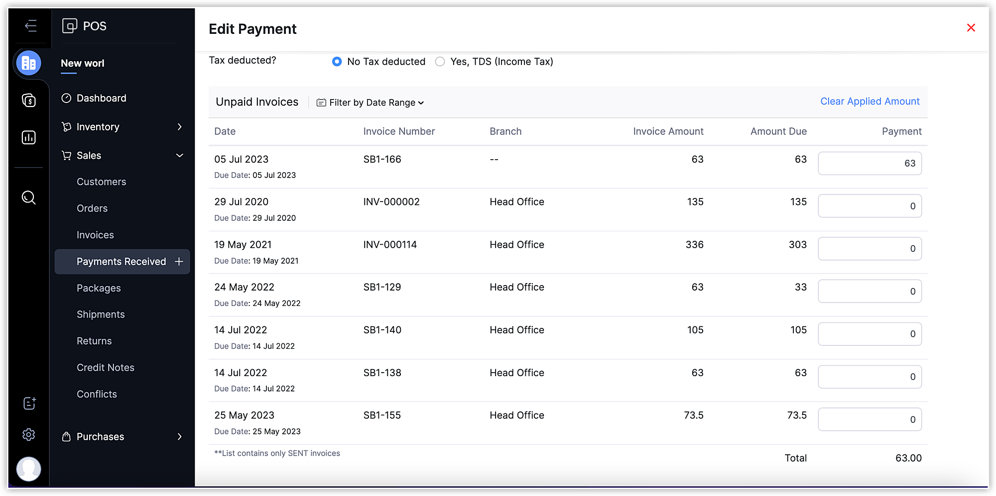 Under the Unpaid Invoices tab, you can see all the listed Invoices and their payments towards them.