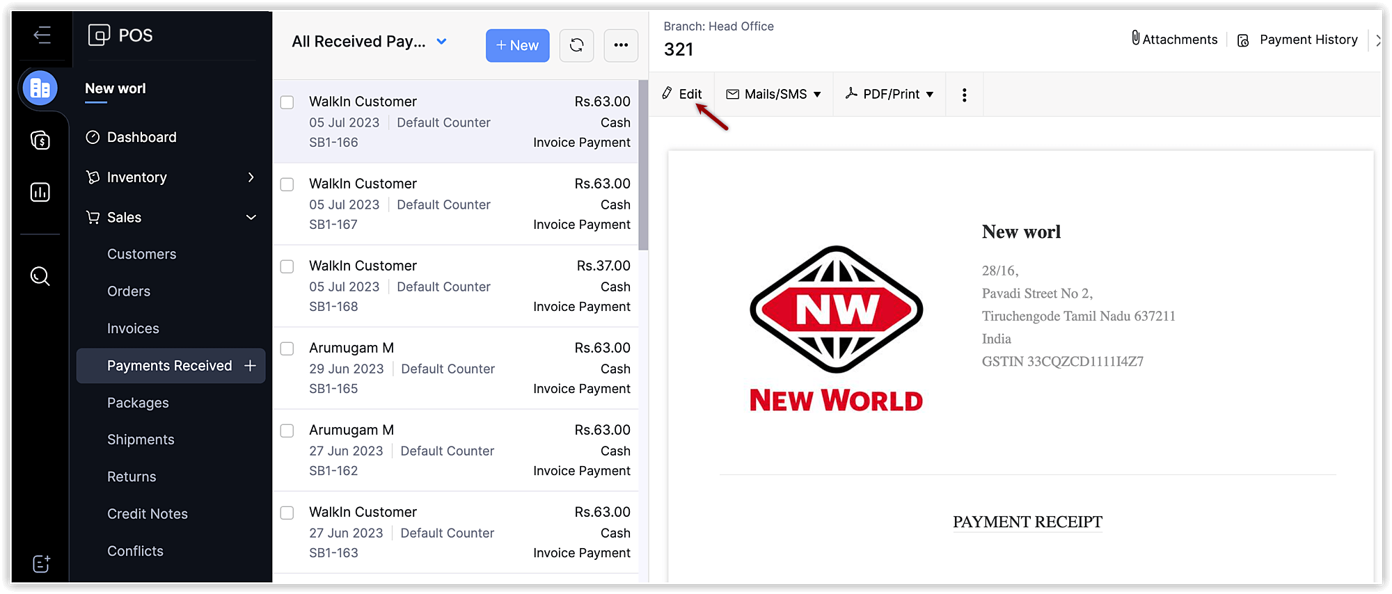 A Payment Received record will include the details of the name of the customer, the amount received, and the invoice for which it is paid. In the top-right corner, there will also be a Payment History, which showcases all the payments that are associated with this particular record. This will also be reflected at Customer ID > transactions > Payments Received.