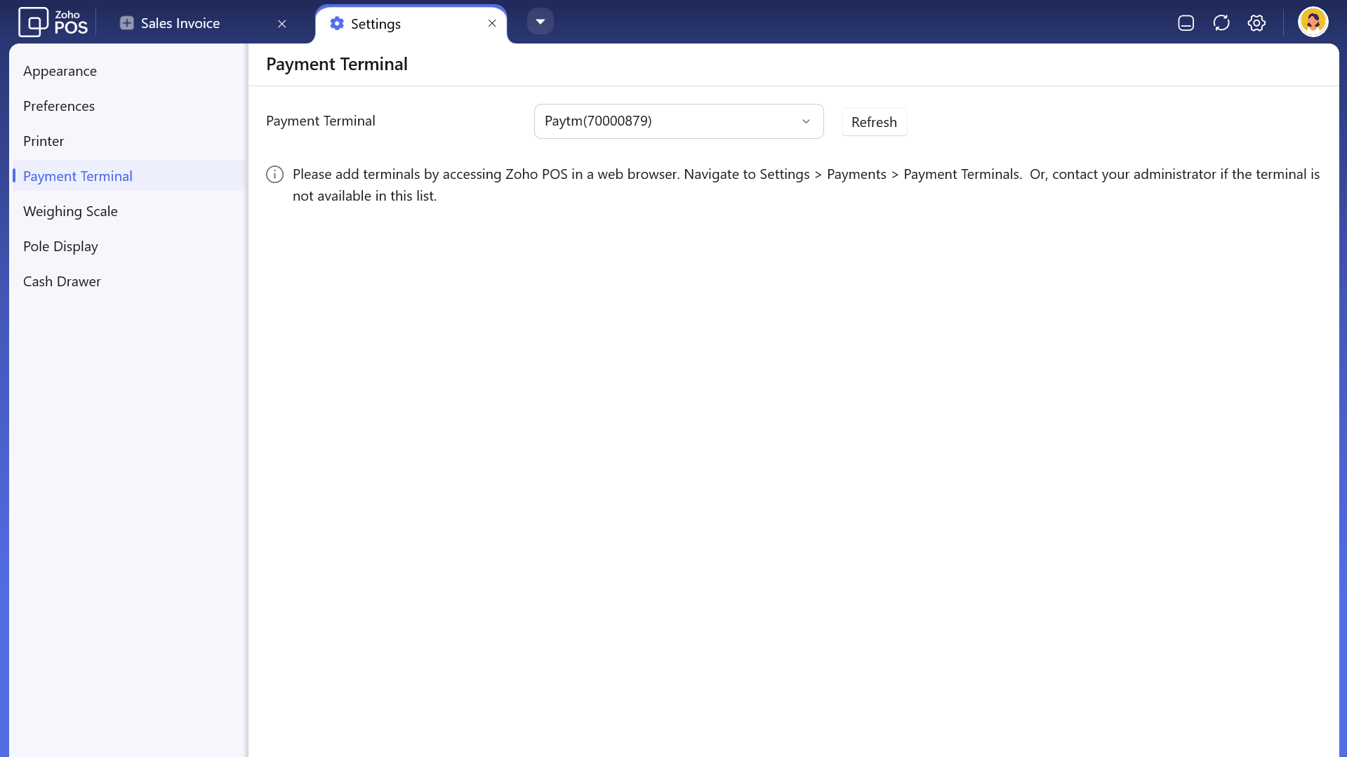 Go to Settings > Payment Terminal from the Zoho POS desktop billing application to map a terminal with a register.All the added terminals are listed here.
