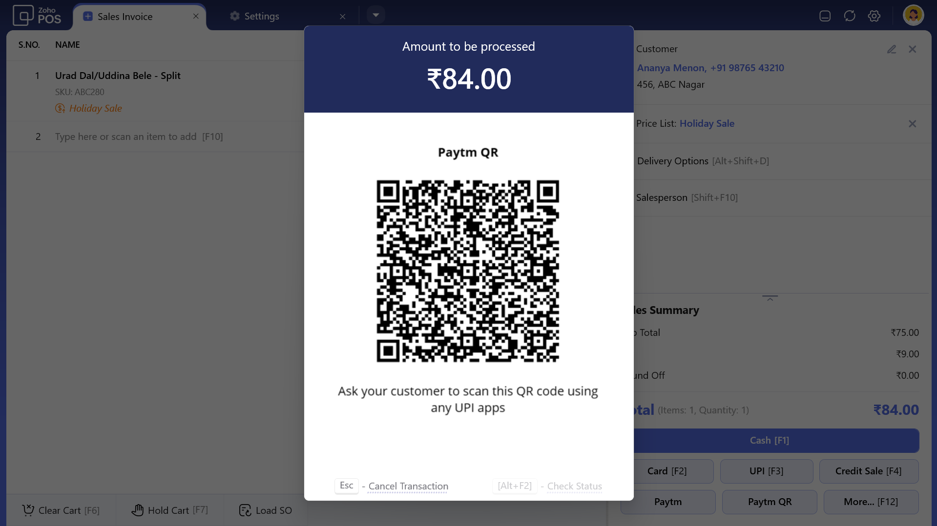 Choose the corresponding tender type to generate a dynamic UPI QR code for the payment. This QR code will appear in the Zoho POS desktop and mobile applications.