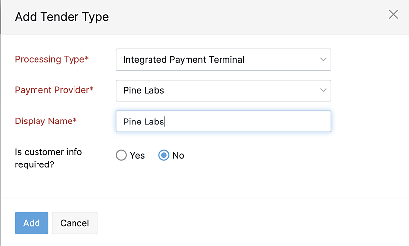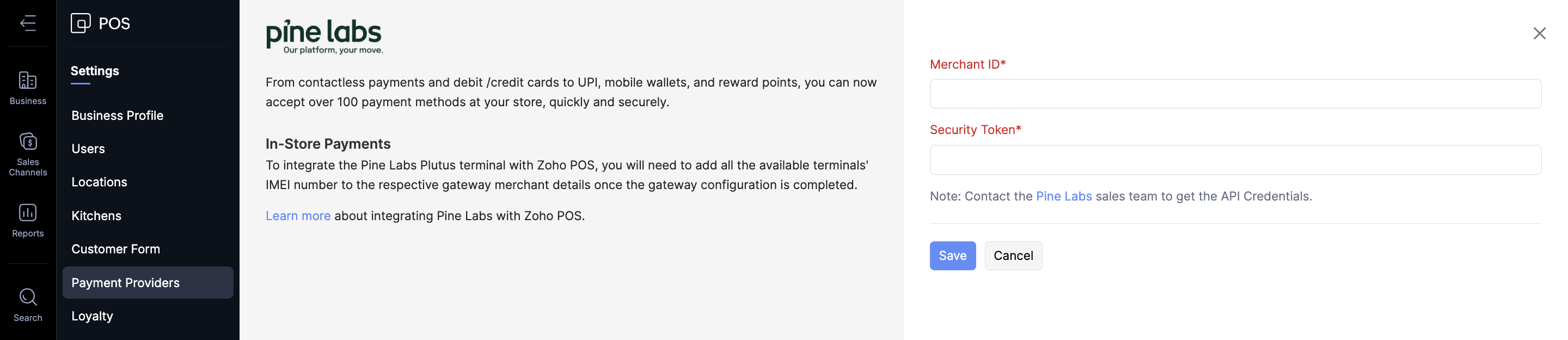 Configure Pine Labs by providing the following details: Merchant ID, Security Token.