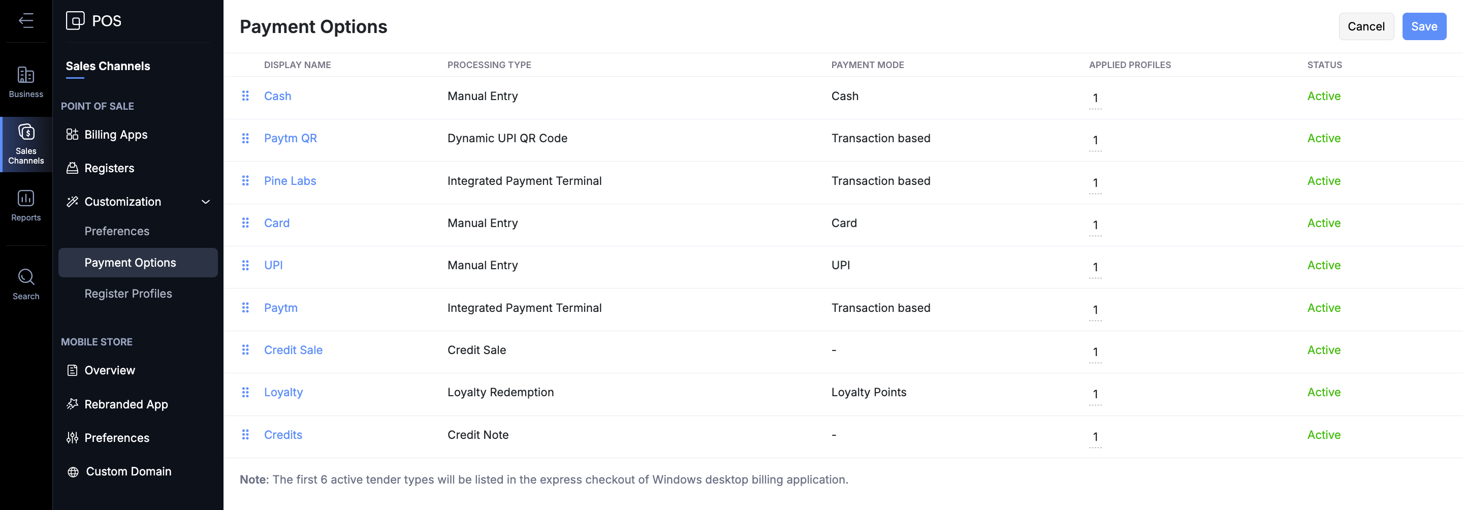 Click Change Order and drag the options to re-order them on the display screen.The first six tender types will be listed in the Zoho POS desktop billing application.