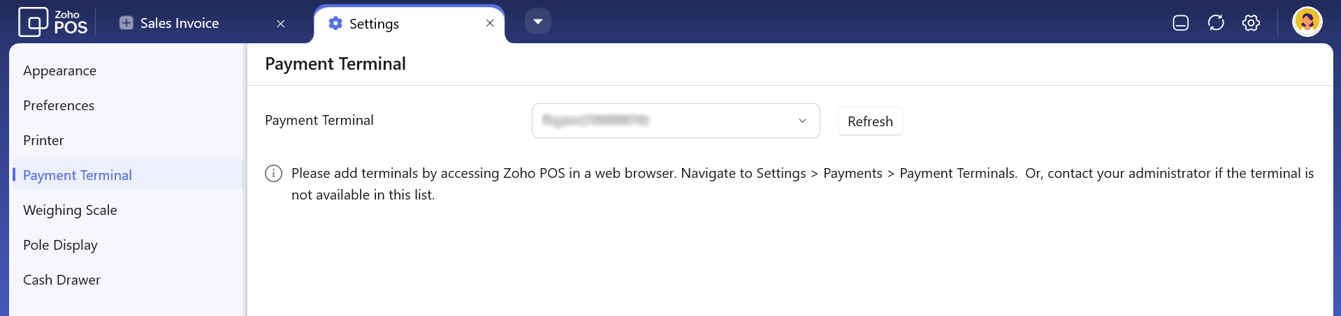 Go to Settings > Payment Terminal from the Zoho POS desktop billing application to map a terminal with a register. All the added terminals are listed here.