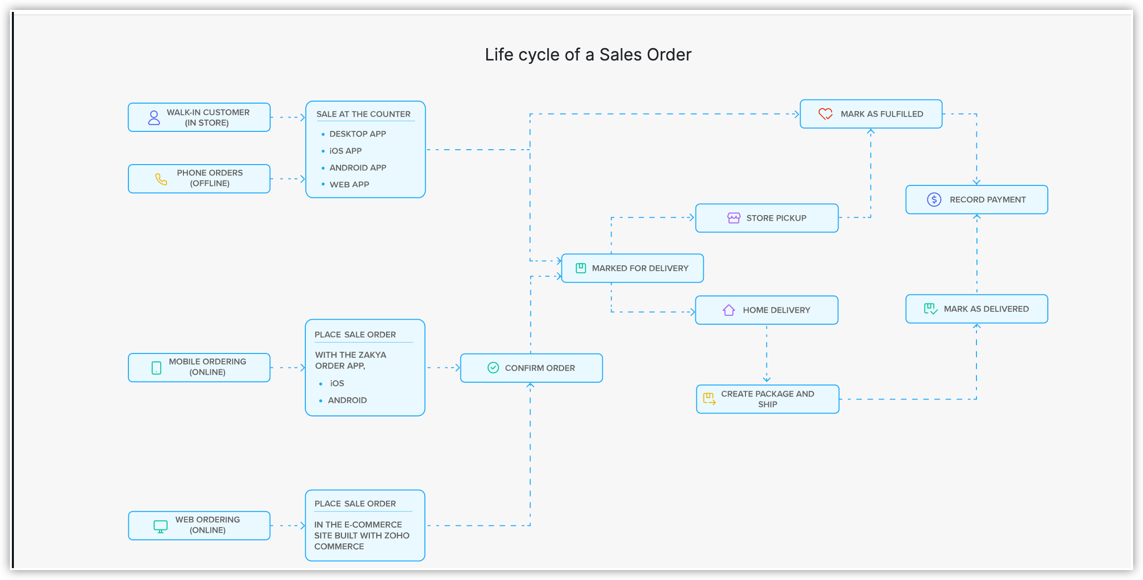 Introducing Zoho POS POS has enabled Zylker Pharmacy to maintain a clear record of online purchases and a separate record of direct in-store or walk-in purchases which will usually be recorded as an Invoice. Sales Orders act as a clear indicator of the Sales Performed, the items cancelled or returned and it also acts as a visual marker to gauge the most selling item. Thus, providing Zylker and their clients a hassle free shopping experience while being accurate on the sales metrics.