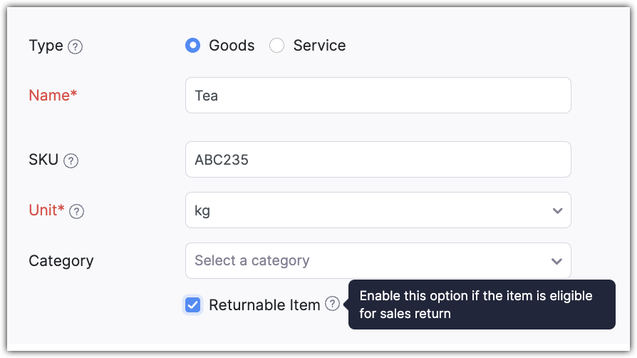 If the type of an item is Goods and is marked as Returnable, it can be returned by the customer. Services can't be returned.