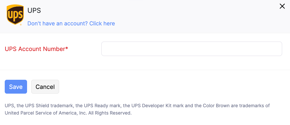 If you do not have a UPS account, you can create one and specify the account number for integration. Before you complete the integration, please read the UPS terms of service.