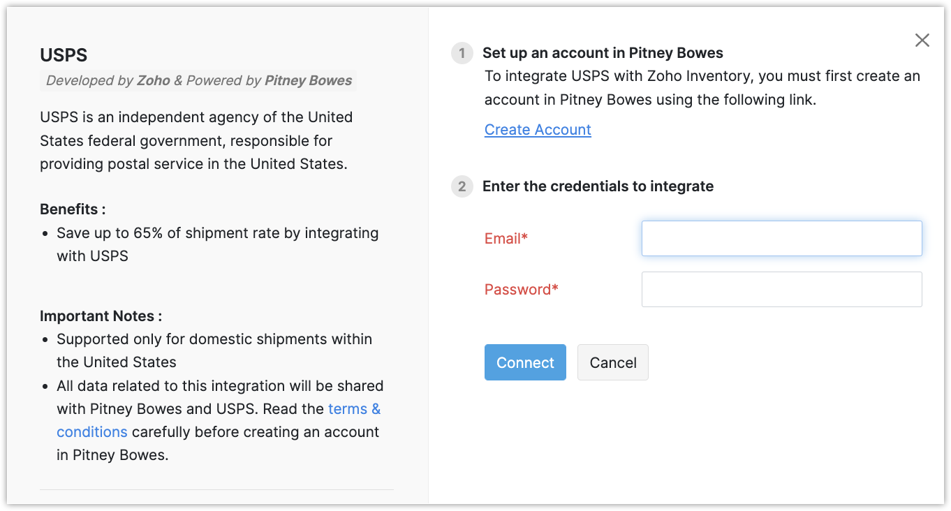 USPS powered by Pitney Bowes is an independent agency of the US federal government responsible for providing the postal service in the United States. In order to integrate USPS with Zoho POS, you need an account with the USPS.