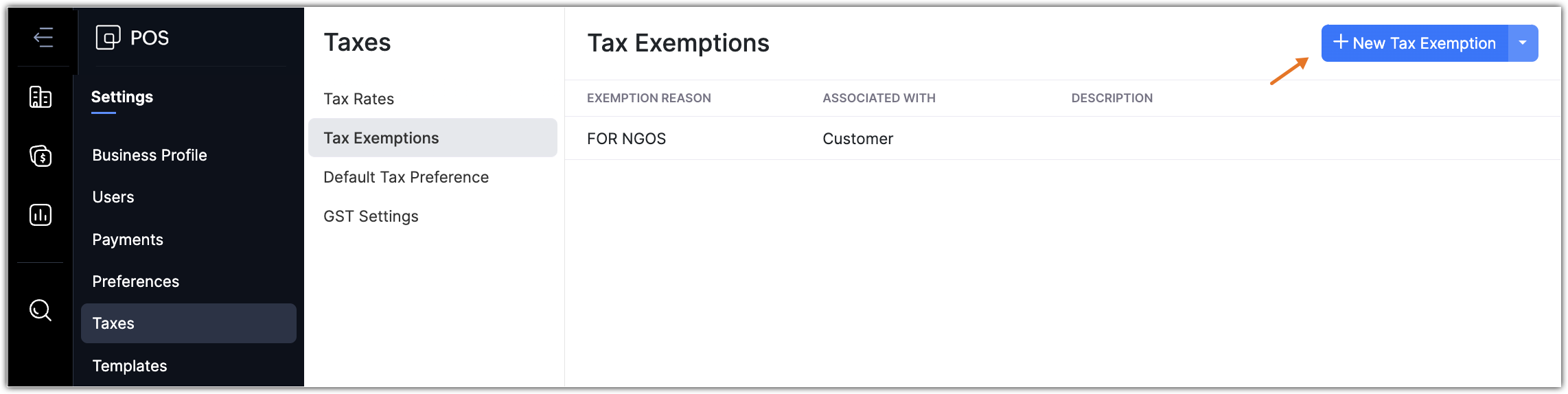 In India, tax exemptions are applicable for different products and for a specific set of customers. For example, fresh milk, vegetables, fruits, eggs, coffee, and spices are exempted from GST. Similarly, NGOs and other charitable trusts are exempted. In Zoho POS, you can add the reason for tax exemptions for an item or a customer.