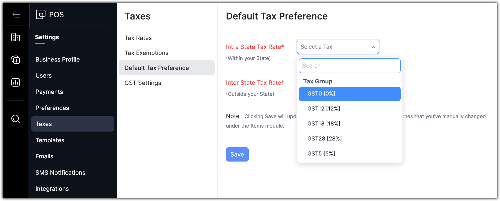The default tax rates for inter- and intra-state transactions can be specified. The chosen tax rates will be applied to all the items and transactions in Zoho POS. You can choose to change a tax rate manually if required.