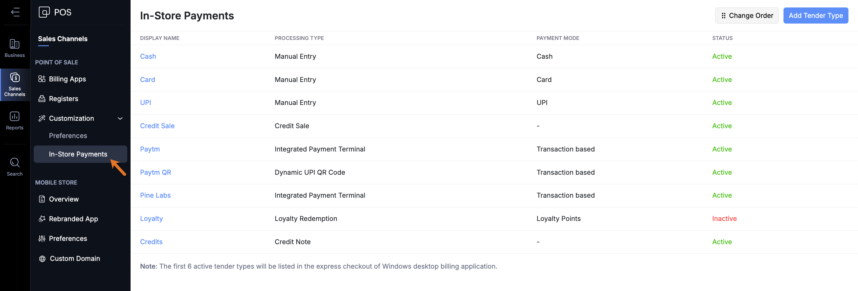 Go to Sales Channels > Customization > In-Store Payments.