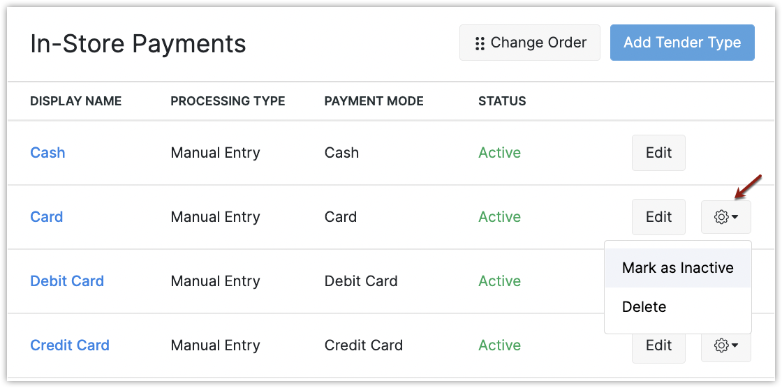 Click the Settings icon next to the payment method and select Mark as Inactive or Delete.