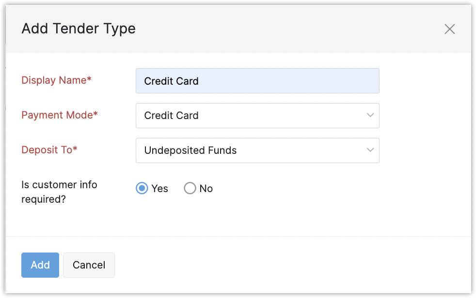 In the Add tender type popup, do the following: