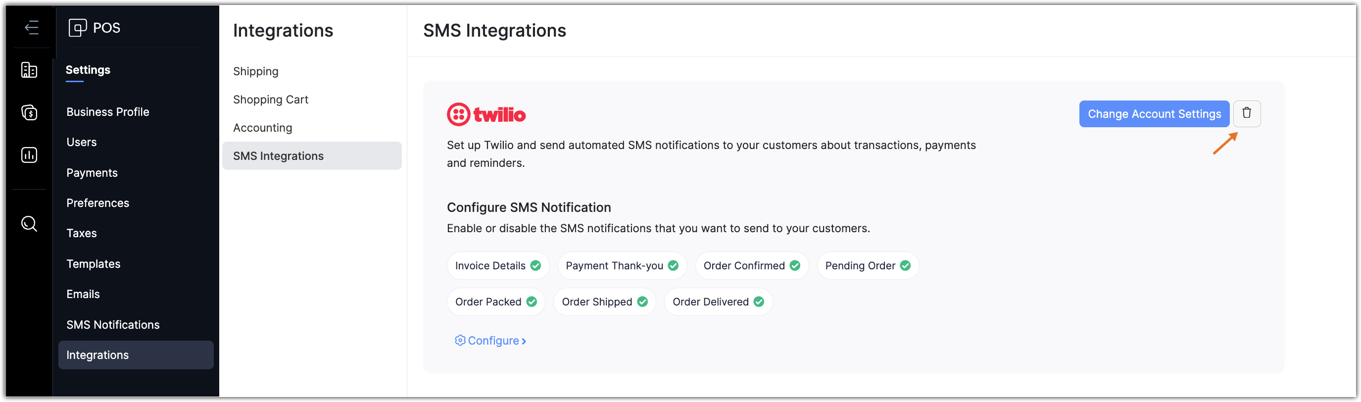 The Account SID, Auth Token, and Phone Number can be modified by clicking Change Account Settings in the Twilio section of the SMS Integrations page.