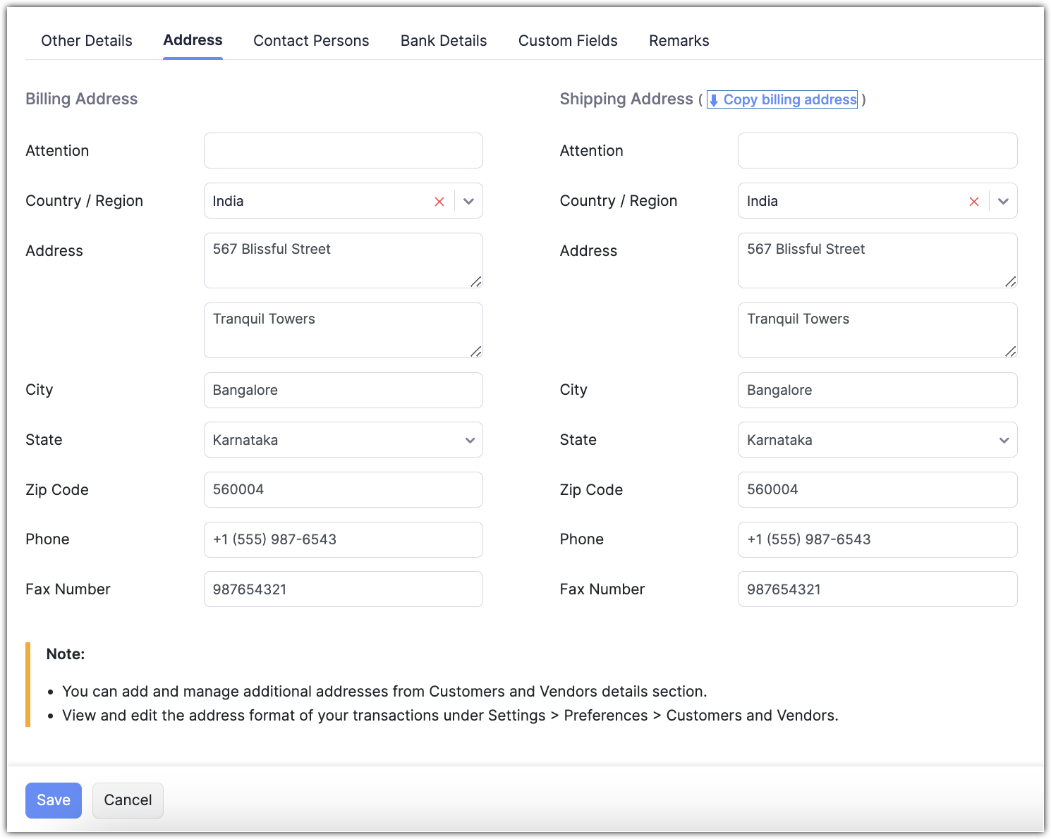 Click the Address tab to add Billing and Shipping addresses. If the Shipping address is the same as the Billing address, you can click Copy billing address button.