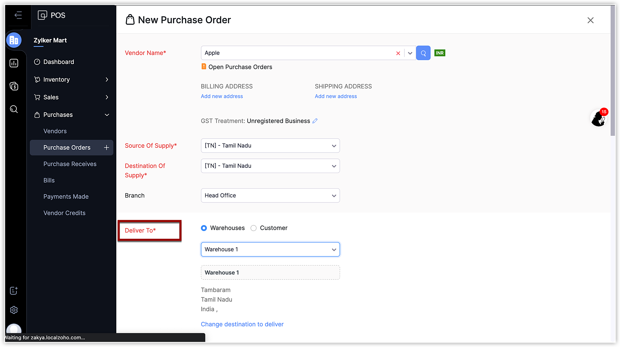 For a business, it is crucial to purchase and keep items in stock. Whats equally important is the storage location of the Item purchased. On placing a purchase order, the business can business the warehouse they want the items to be delivered to. There are multiple options for doing this.