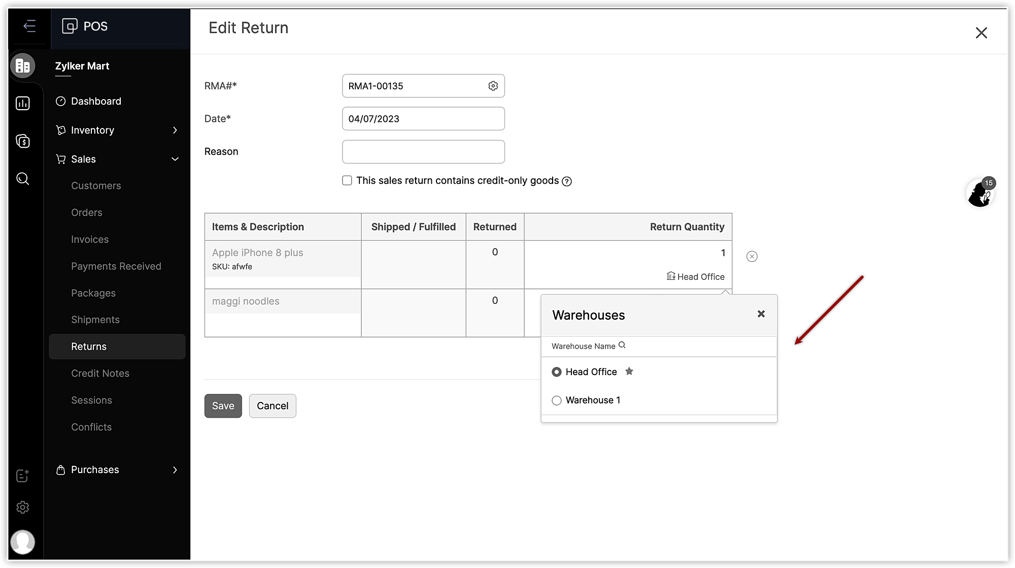 Fill in the details and select a Warehouse from the drop-down where the returned items are to be stored.