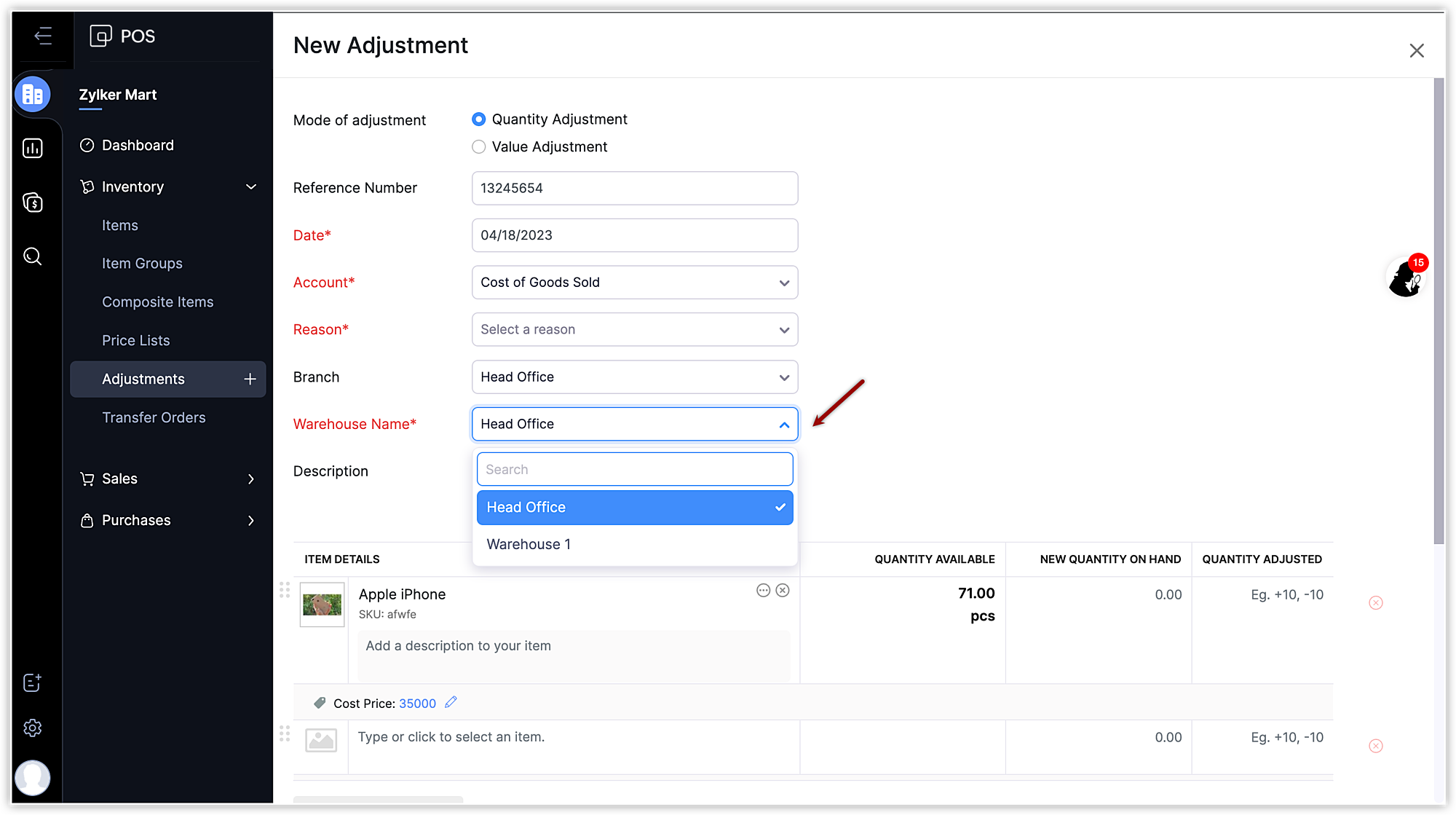 Fill in the details and select a Warehouse from the drop-down where an Item stock needs to be adjusted.