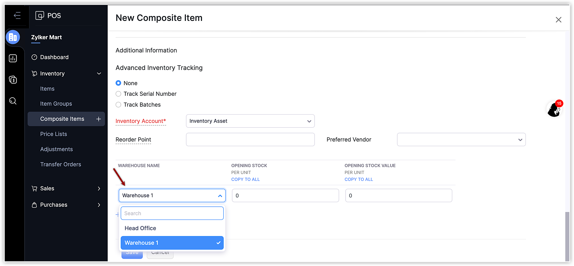 Fill in the details and select a Warehouse from the drop-down from which the items should be added for the bundle.