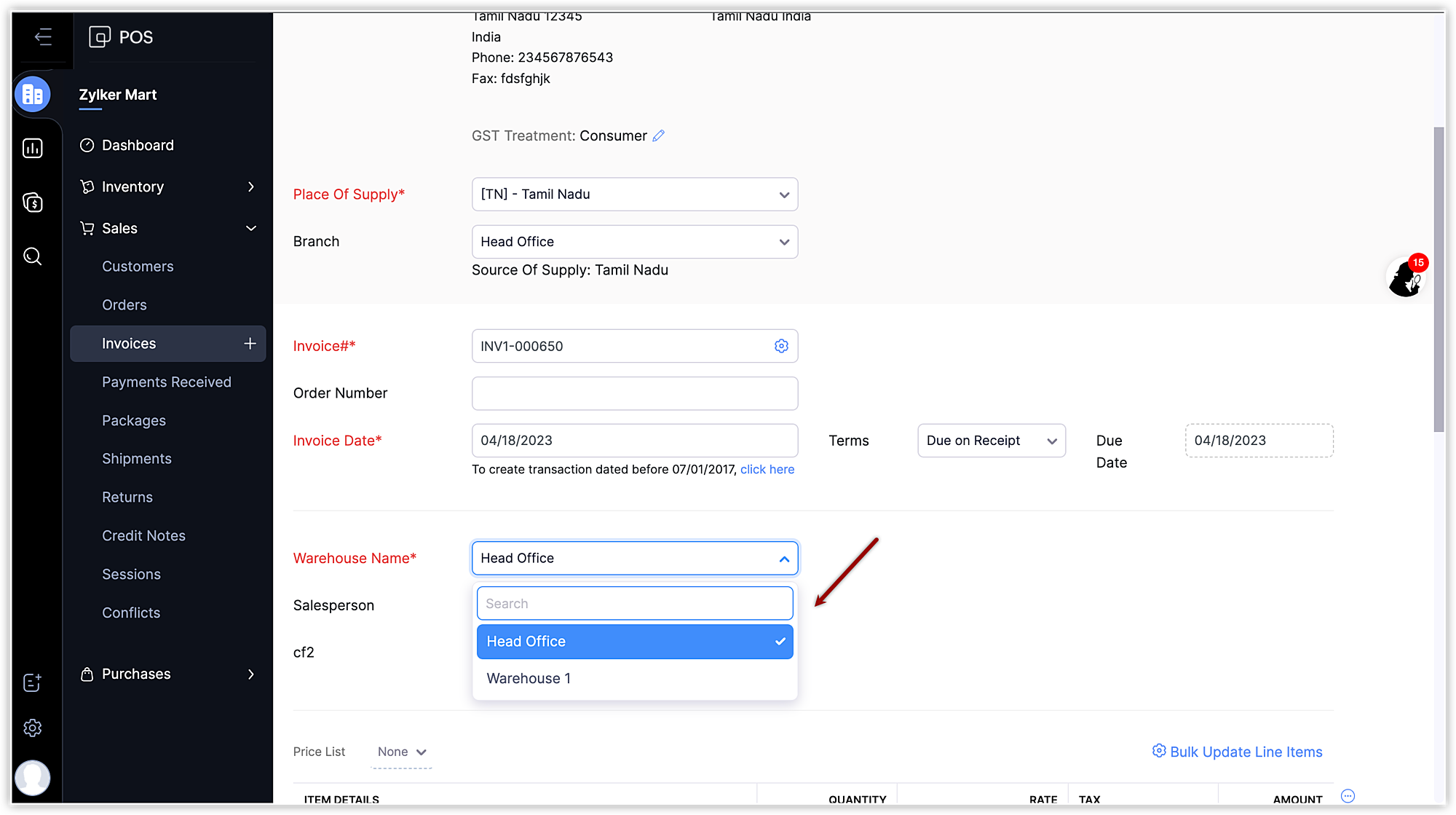 Fill in the details and select a Warehouse from the drop-down from which the Items are to be dispatched.