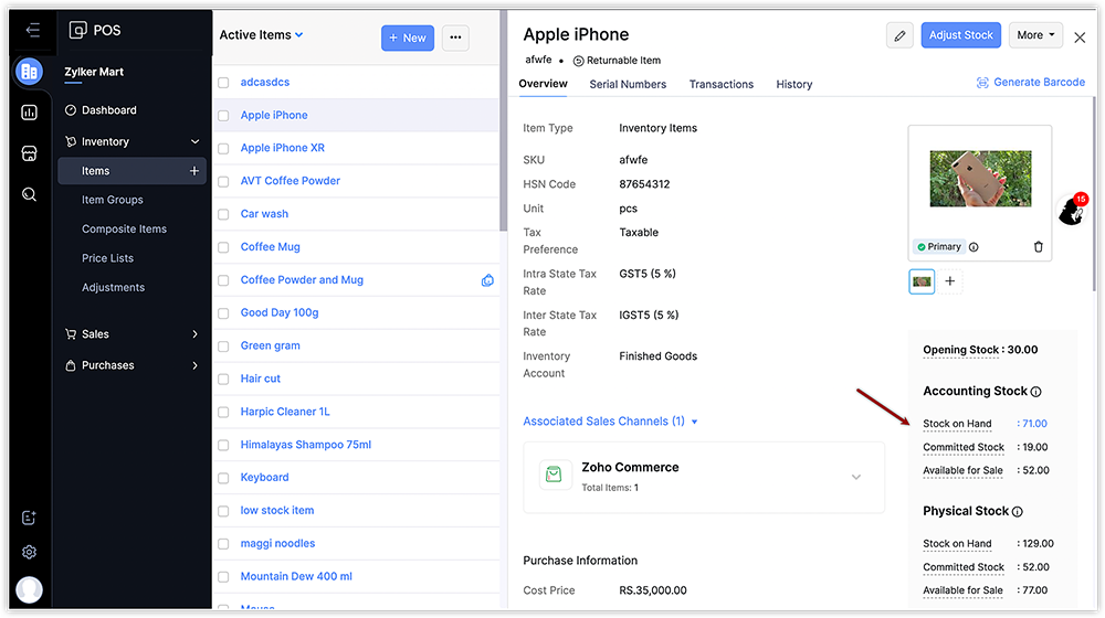 In Zoho POS, all the item stock will be automatically stored in the primary warehouse, unless mentioned otherwise. In a business, an item could be required at one location while it's available or stored in another. To resolve this, stock or item transfer can be done from one warehouse to another. To do so: