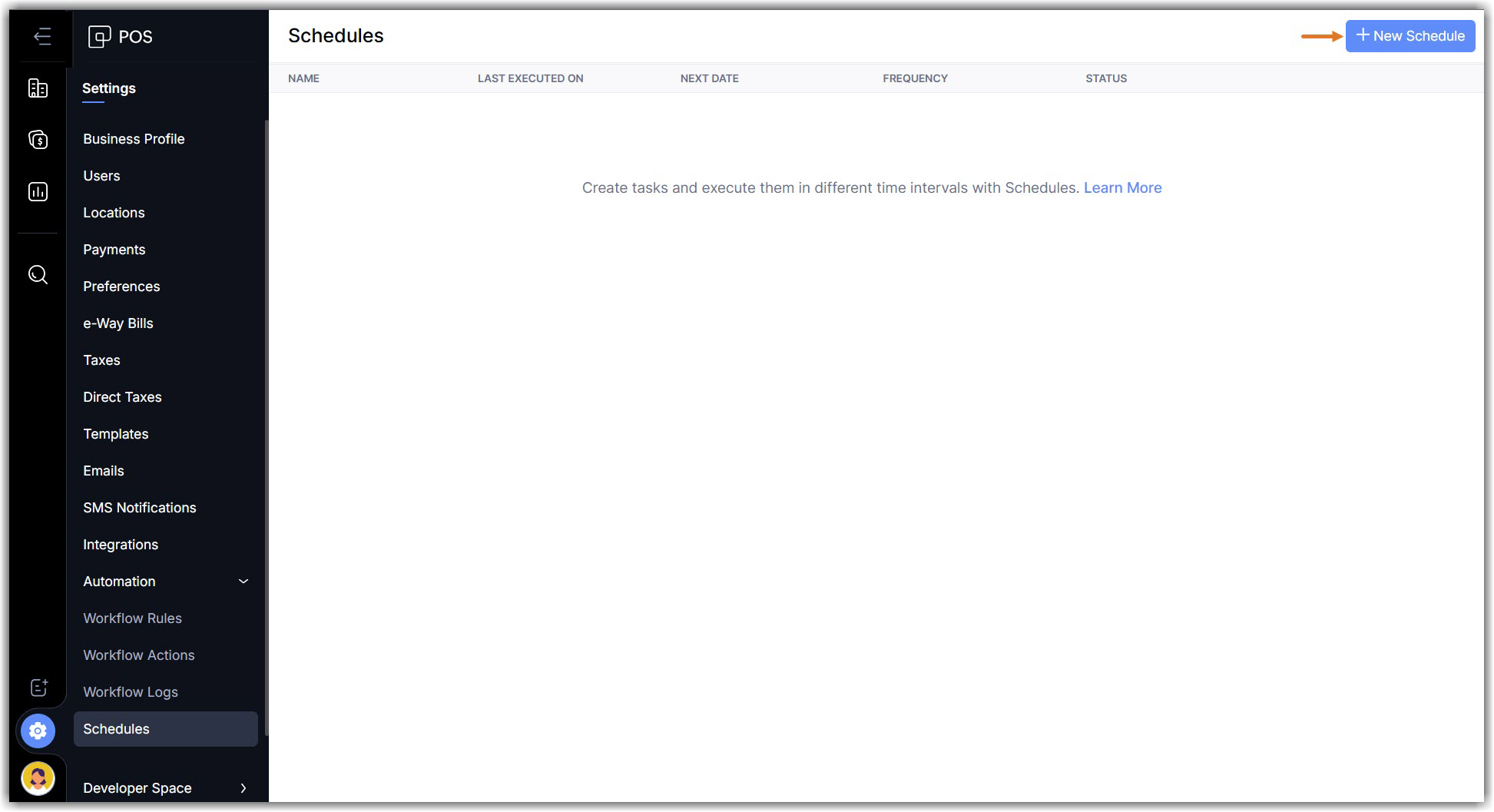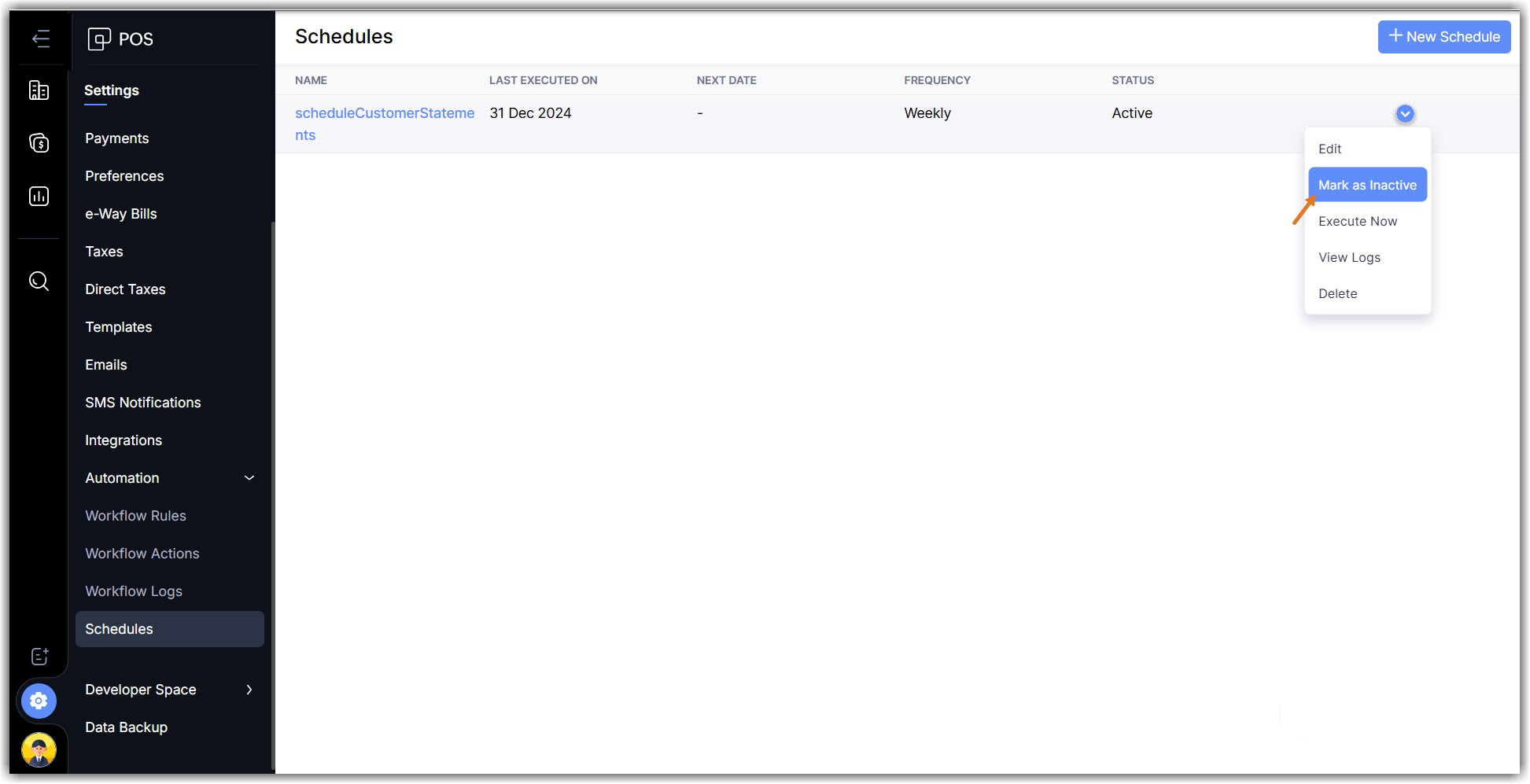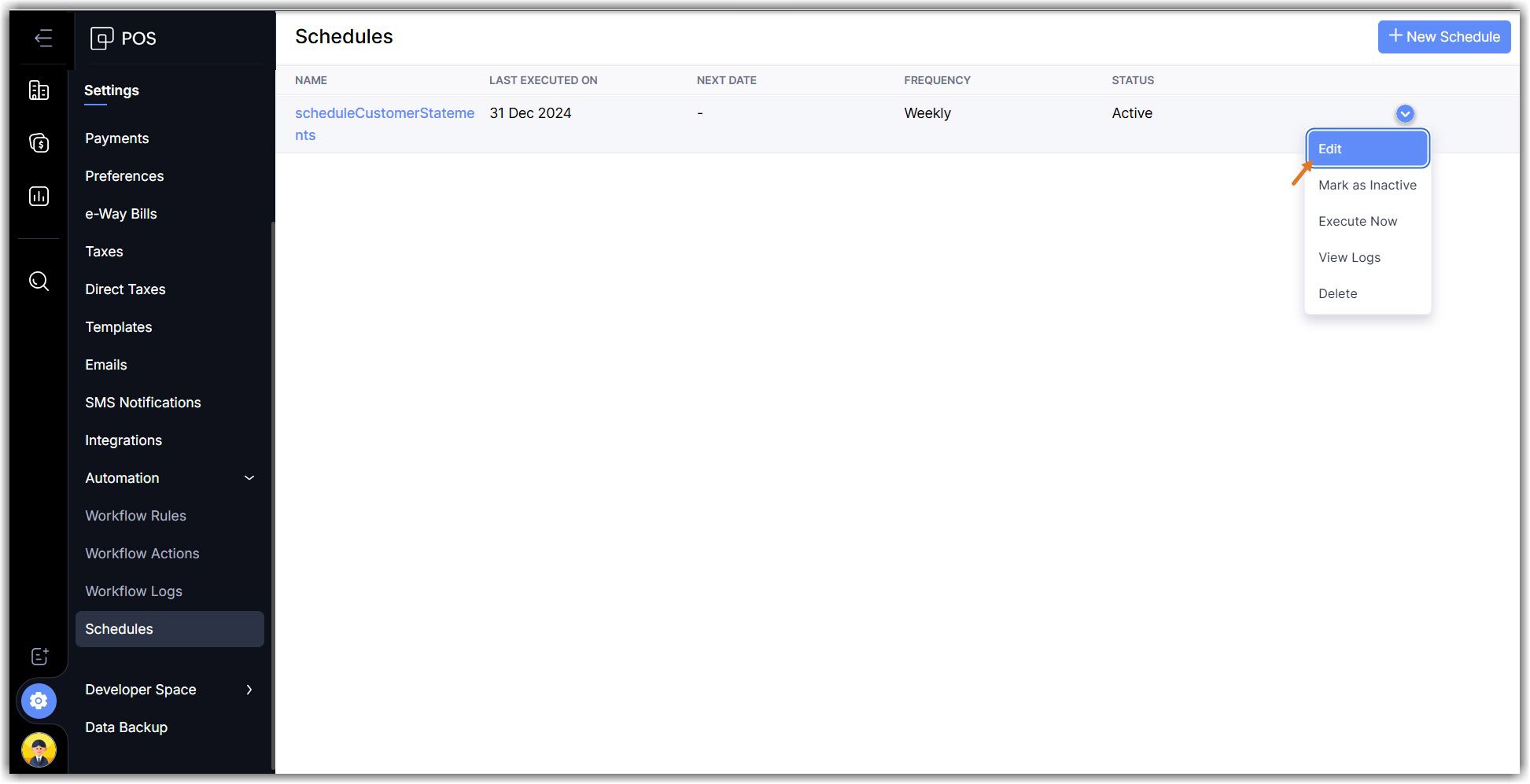 Zoho POS lets you create and run predefined tasks at the specified time intervals using schedules. You can create your tasks using a Deluge script and schedule this task to be executed at a particular time or on a recurring basis.