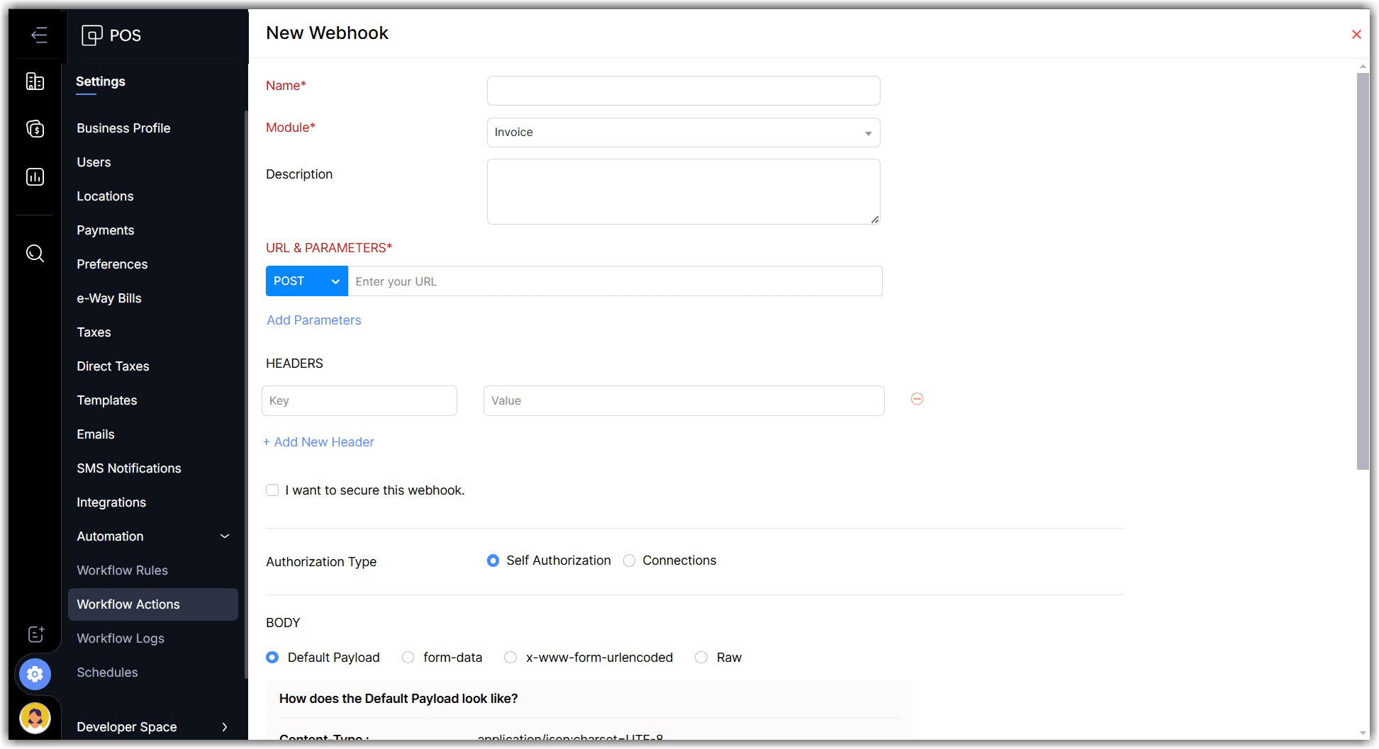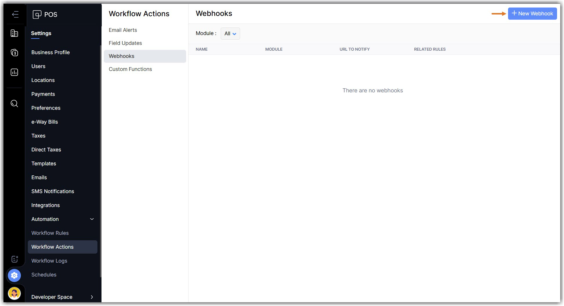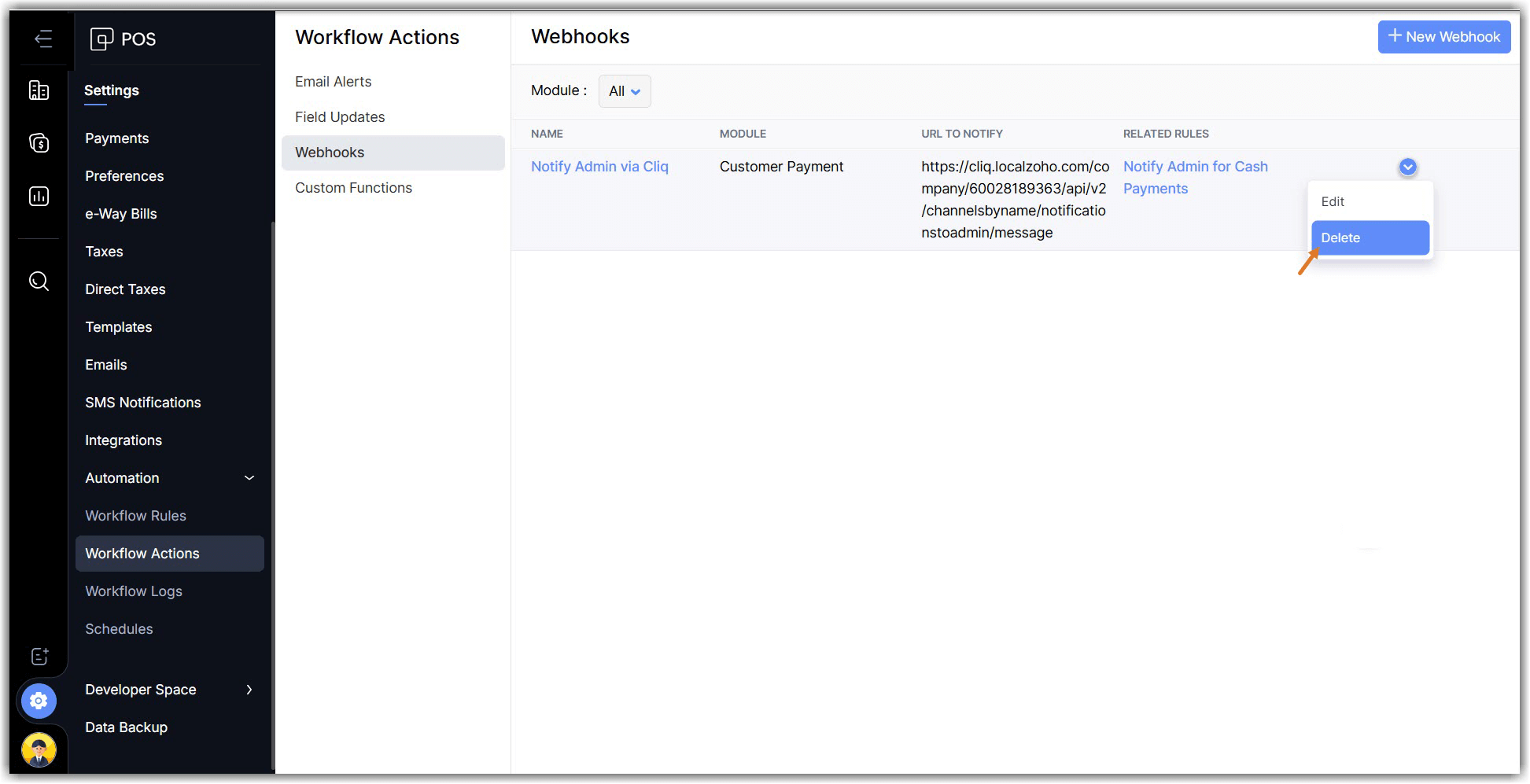 Webhooks helps Zoho POS communicate with the third-party applications by sending instant web notifications every time an event occurs. You can configure HTTP and HTTPS URLs and associate them with workflow rules to automate the notification process. In some cases, this notification can be utilized to initiate an action in another application.