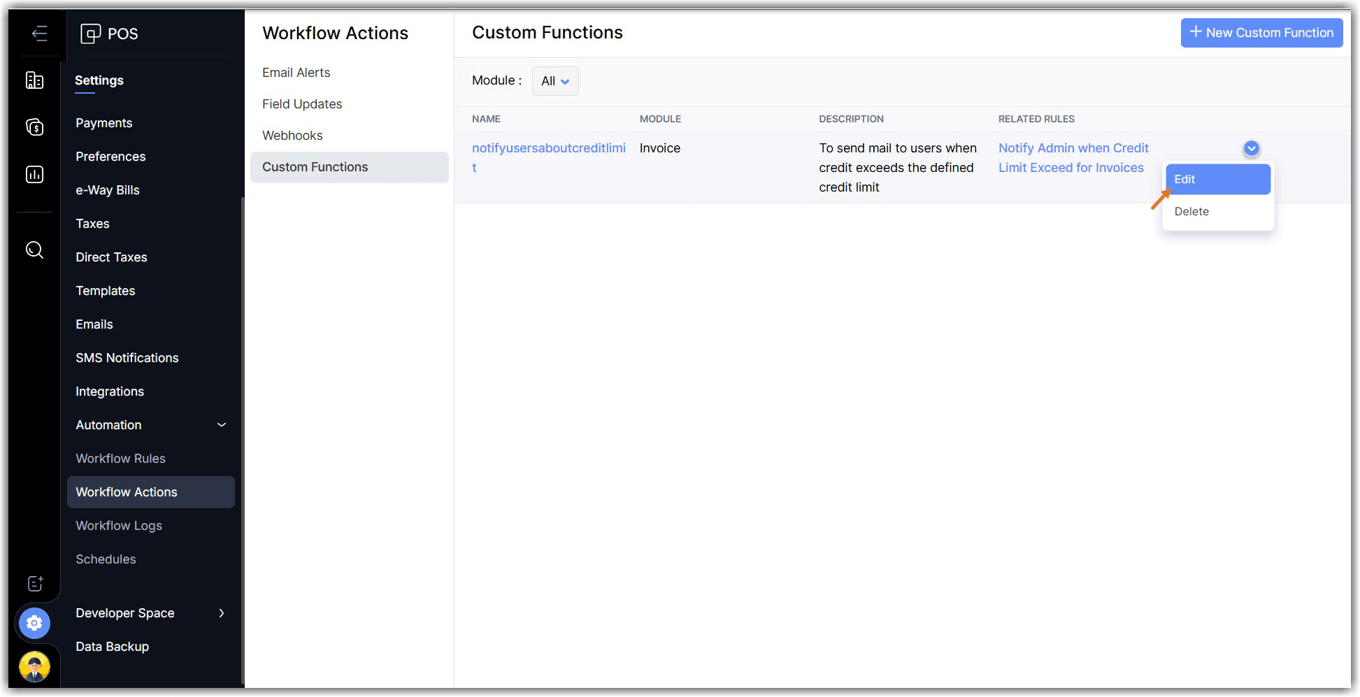 Zoho POS's custom functions allow you to automate your business operations by writing short pieces of code. Whether you're offering a special discount on your customers' invoices or charging a late fee for exceeding their credit period, simply create a code in Deluge script and associate it to a workflow rule, and the process will be automated.